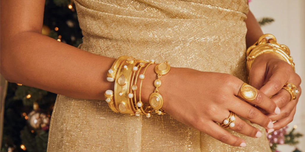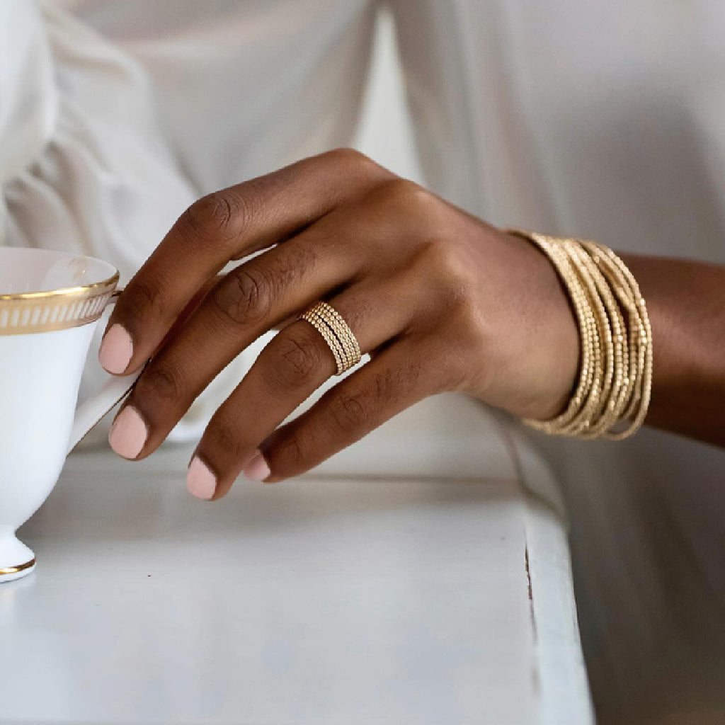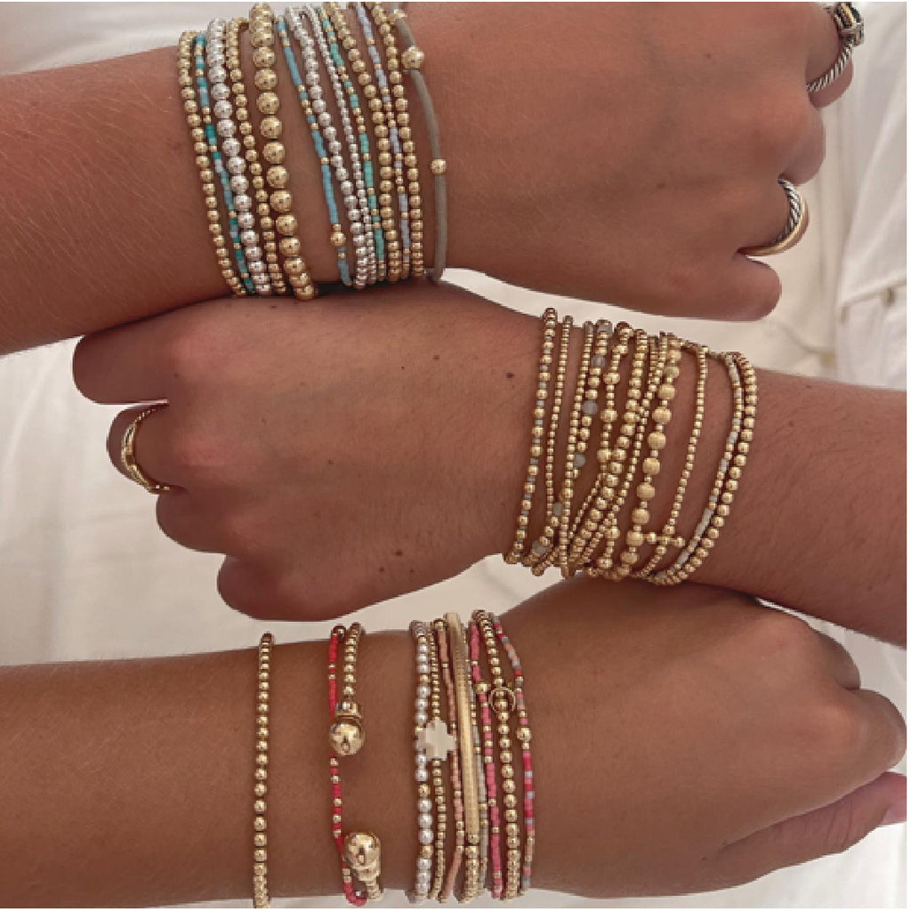 Made with 14kt gold-filled beads, worry-free wear‚ which means sleep, shower and sweat in it. Hand beaded on high performance elastic for a slight stretch to easily roll on and off your wrist.