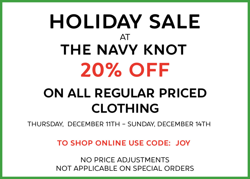Celebrate the season with 20% off all regular priced clothing! Shop some of your favorite brands like Sail to Sable, Vineyard Vines, Lilly Pulitzer, Jude Connally and many more! Use code: JOY