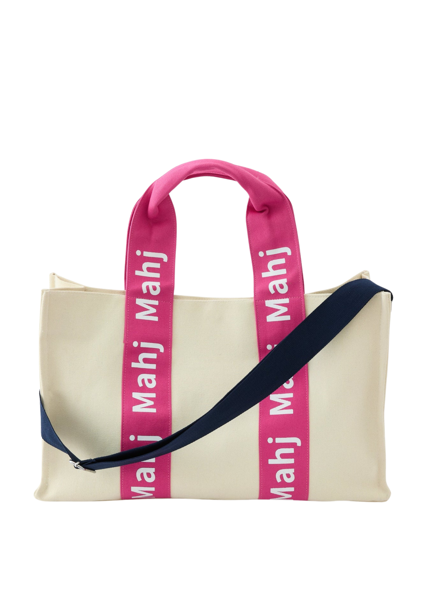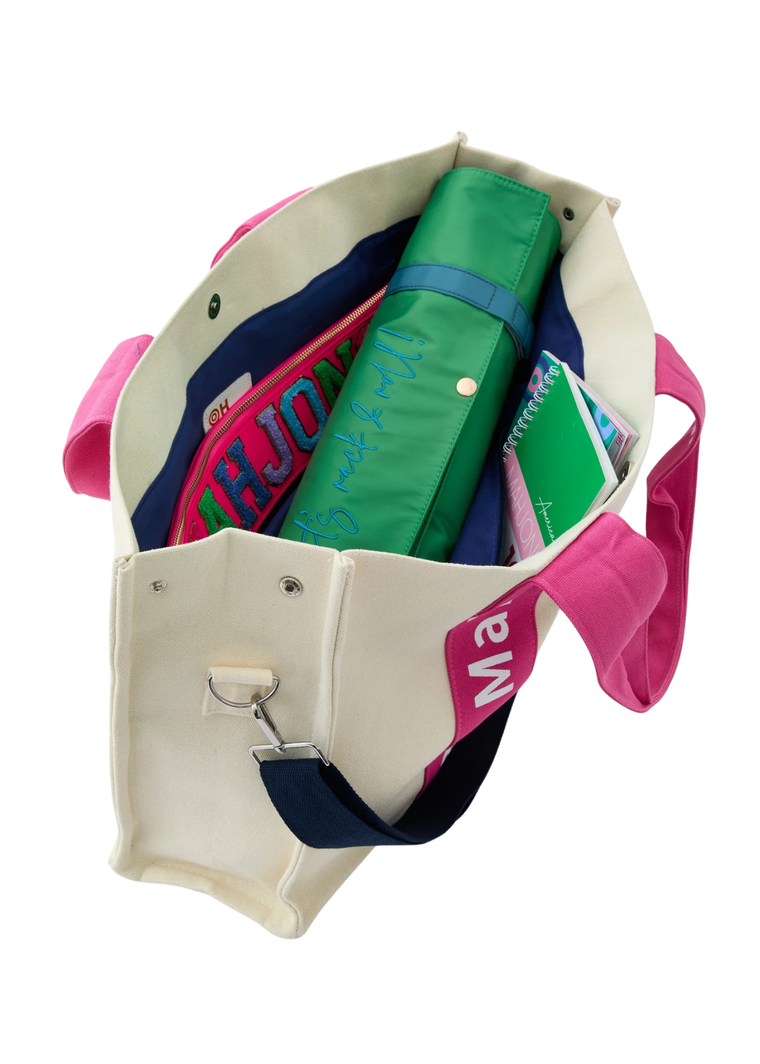 Introducing the Mahj-It-All Bag! Lined with a blue interior, this refreshed canvas storage companion is designed to bring a smile to your face. Not only does it elevate your Mahjong gaming experience, but it also doubles as a fantastic work bag. This spacious bag is tailor-made to accommodate all your Mahjong essentials, including tiles, racks, the rack & roller bag, mat, and more. To ensure durability, it comes with a protective dust bag, keeping it in pristine condition. Inside, you'll find two pouches and a zippered pocket for added organization. For convenience and style, it includes a chic crossbody strap, allowing you to effortlessly carry your Mahj-It-All Bag whether you're heading to a gaming session or a busy day at work.
