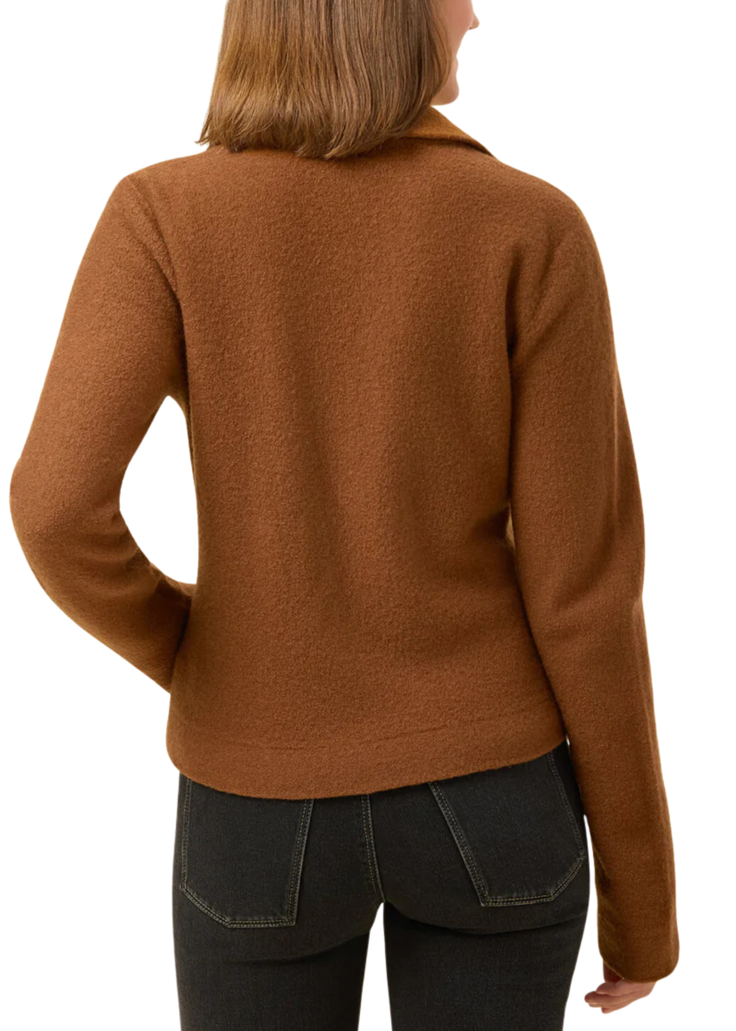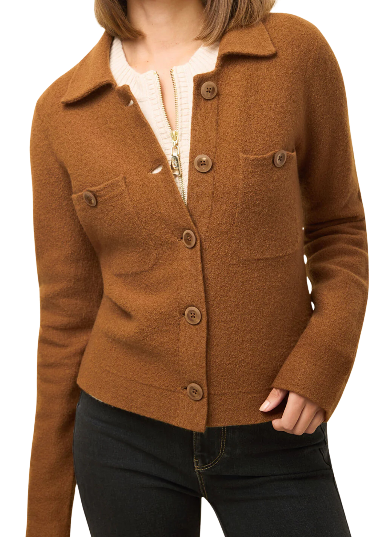 Crafted from a soft 100% felted Merino wool, the Maeve Sweater in a rich toffee hue features a button front, long sleeves, a collared neckline, and patch pockets for a little extra flair. She's the perfect chic layering essential for effortless cool-weather styling.
