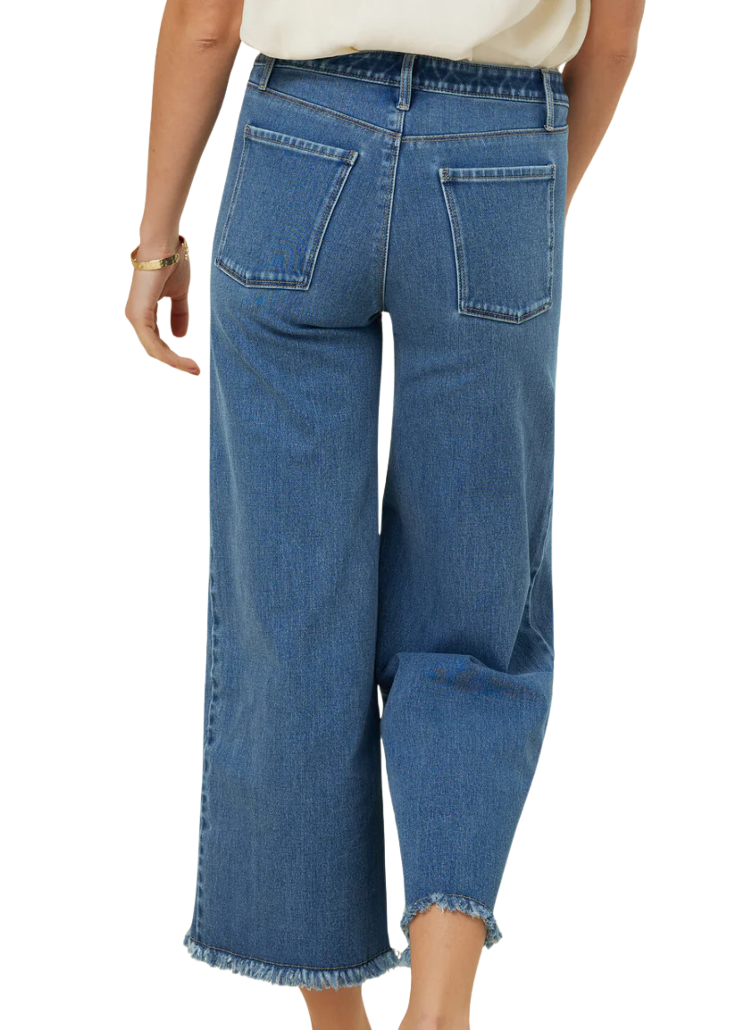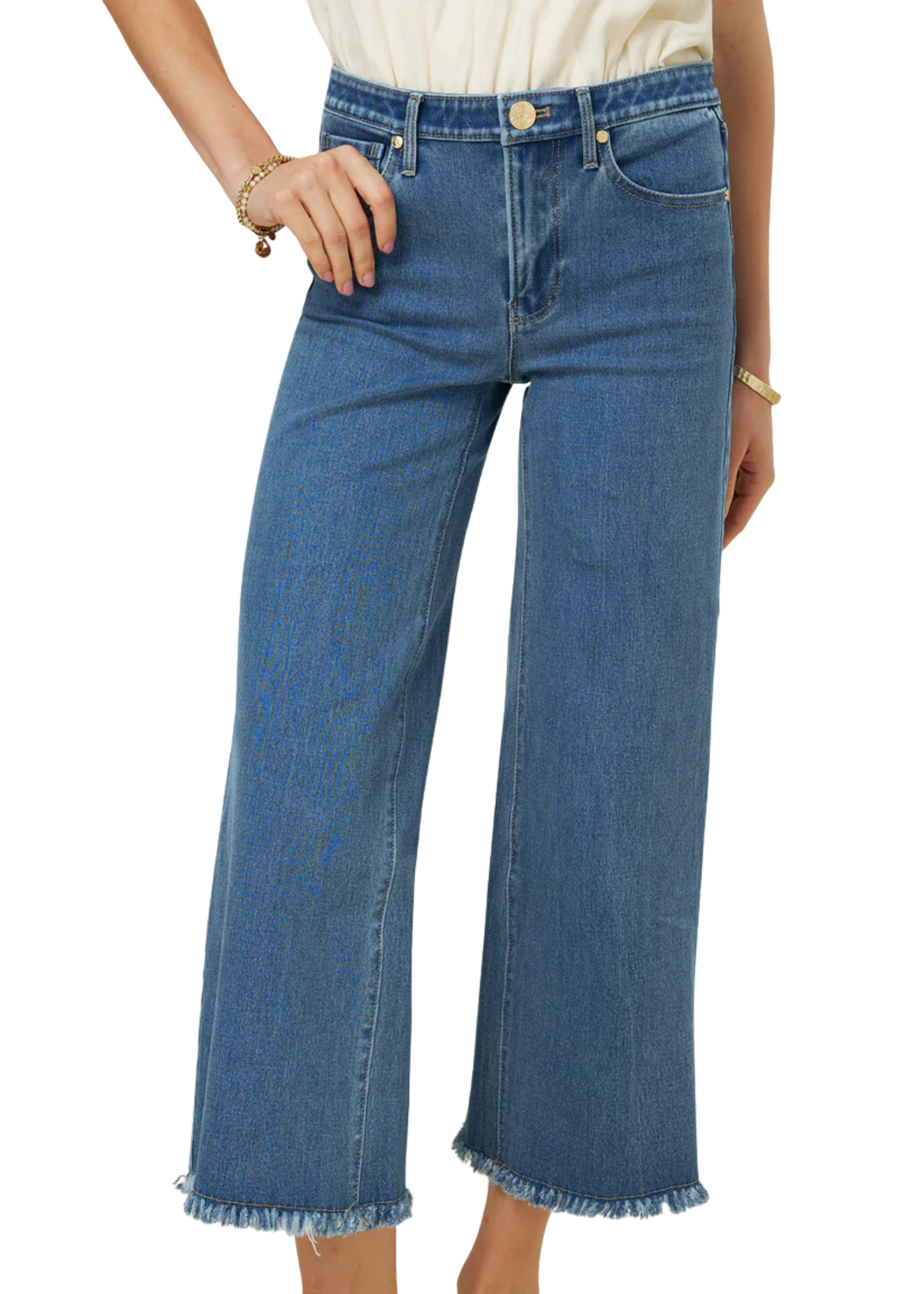Designed for comfort without compromising style, the 5-pocket Nayla Fringe Wide Leg Crop Jean in a morning tide wash is your newest staple in your weekly rotation. The wide-leg style is crafted for comfort and ease in movement, while the high-rise cut elongates and flatters effortlessly. The self-fringe detail at the hems adds a playful finish.