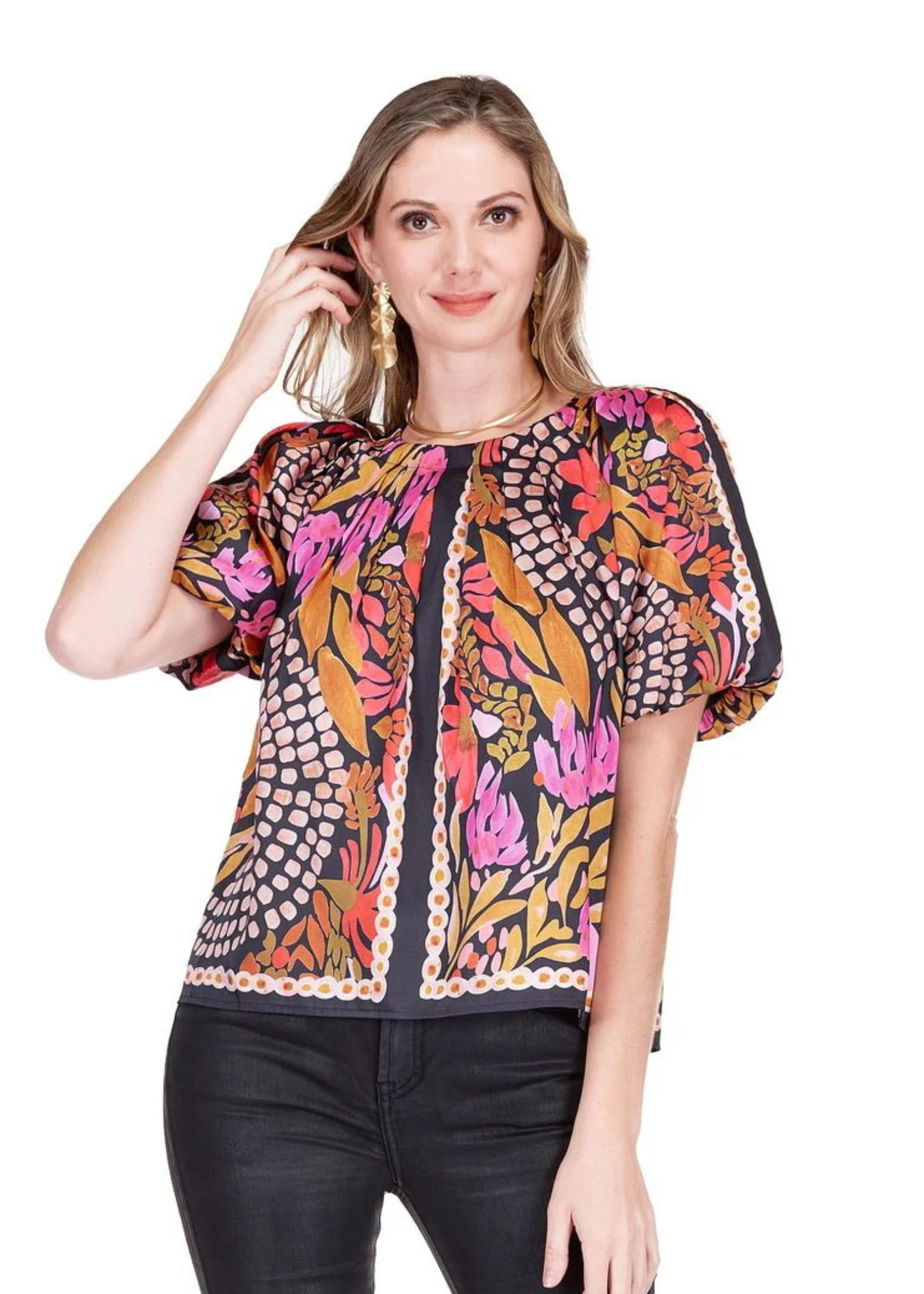 This pleated puff sleeve top is vibrant and stylish, featuring a bold floral and abstract print in pink, orange, and yellow tones on a dark background. It has a round neckline with soft pleats and voluminous puff sleeves that add a feminine touch. A vertical panel with scalloped detailing gives it structure, while the relaxed fit makes it comfortable and easy to wear. Perfect for casual outings or creative settings, it pairs well with dark jeans and simple accessories.