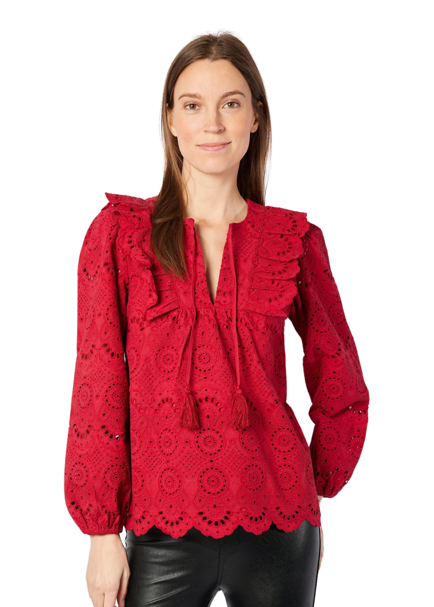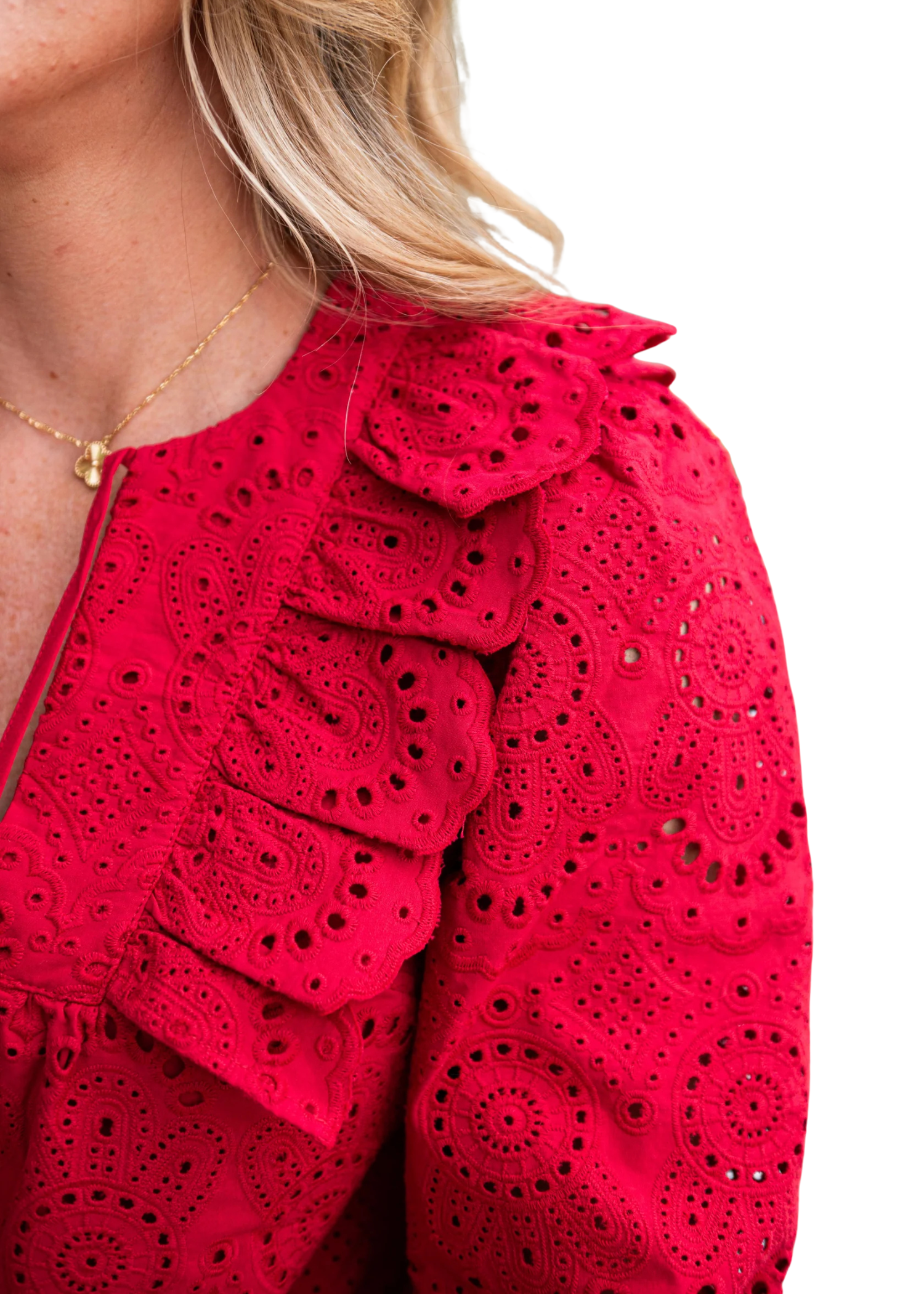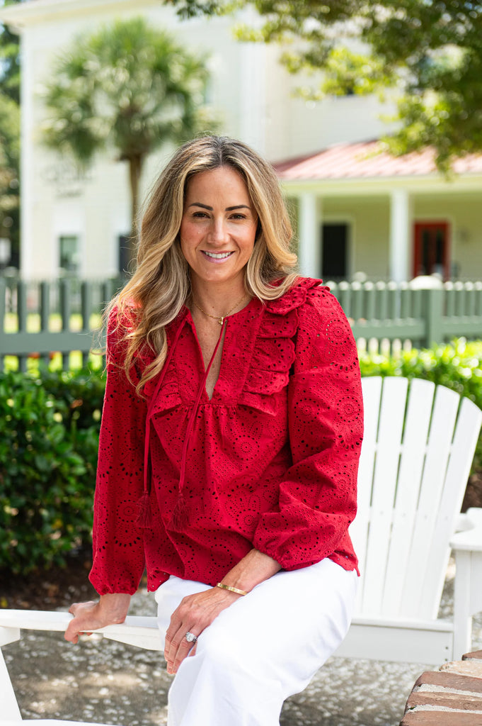 As the leaves begin to change and the temps start to drop, continue to look classic with this Ruffle Front Top. We truly think cranberry eyelet belongs in everyone's fall capsule wardrobes, the ultimate fall hue to keep outfits looking fresh. You will find us pairing this with our favorite crisp, ecru denim for cookbook club night and flower arranging dates with the besties.