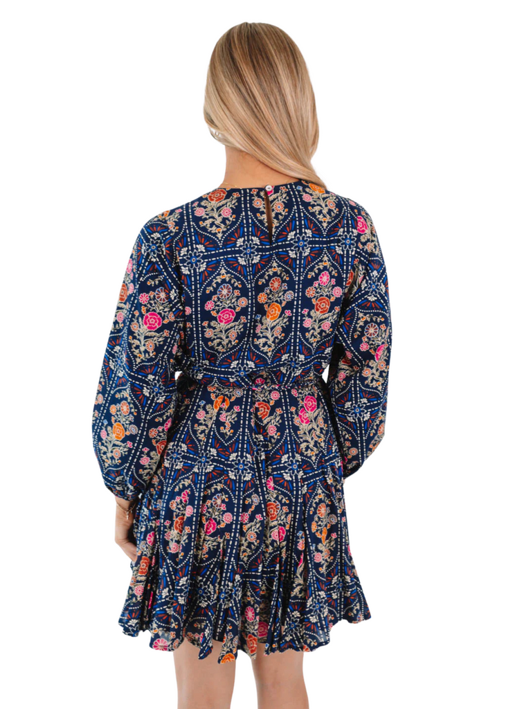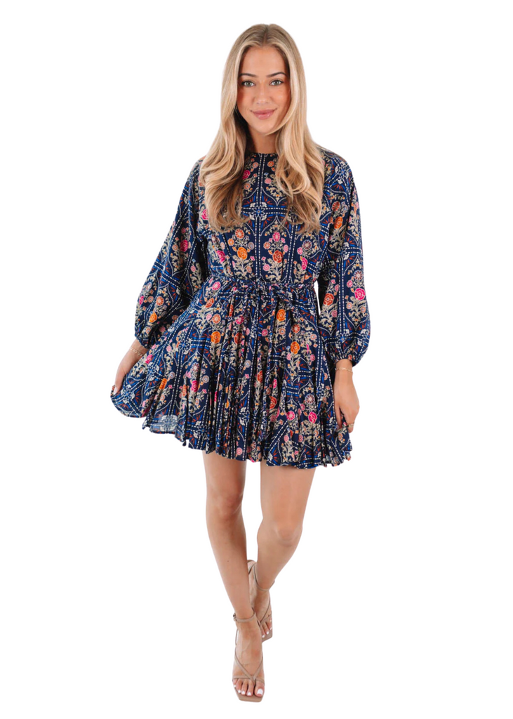 Embrace fall vibes with this navy print dress, featuring long sleeves, a rope tie belt, and a flared skirt for a playful touch. With its scoop neckline and flattering silhouette, it’s the perfect piece for crisp afternoons and cozy autumn adventures!