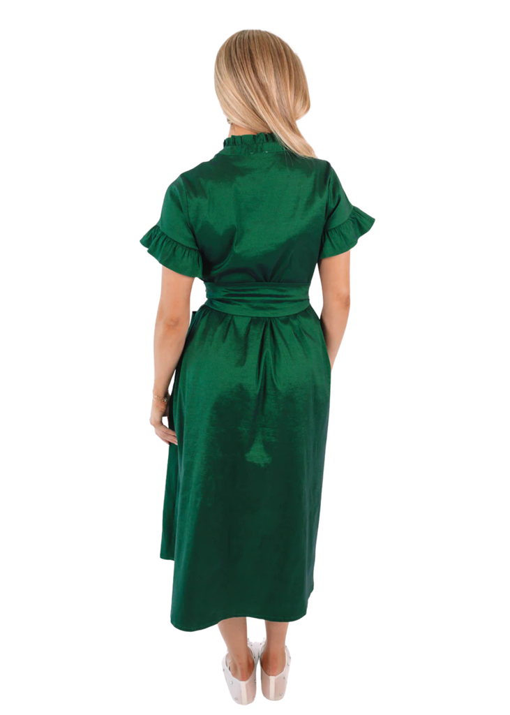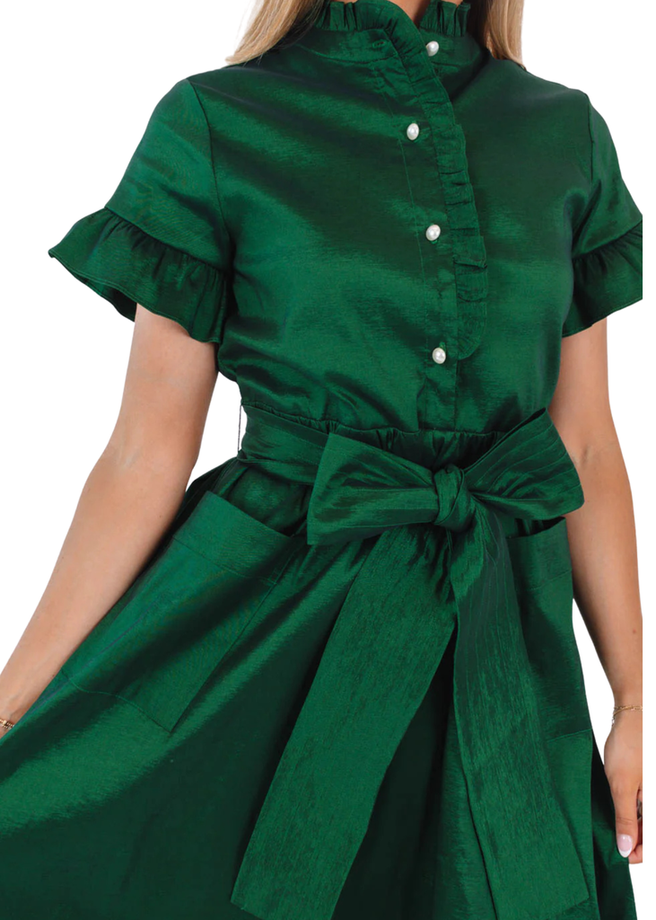 Add a polished touch to your wardrobe with this holiday green dress featuring elegant pearl accents & two front pockets. The button-up neckline & sleek silhouette create a chic, refined vibe - perfect for special occasions or stylish family photos. Pair with your heels for a complete, holiday look!