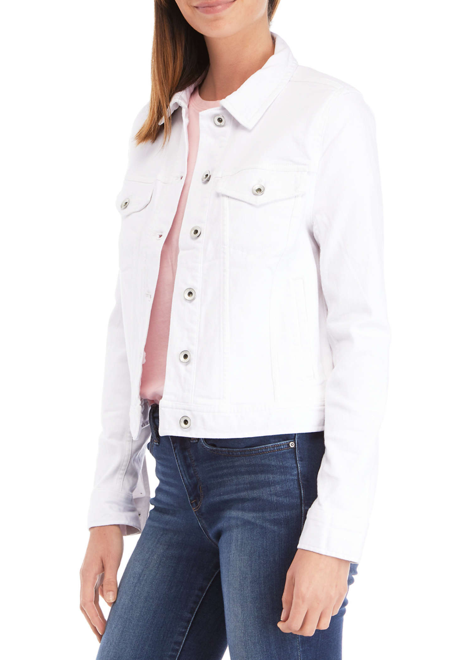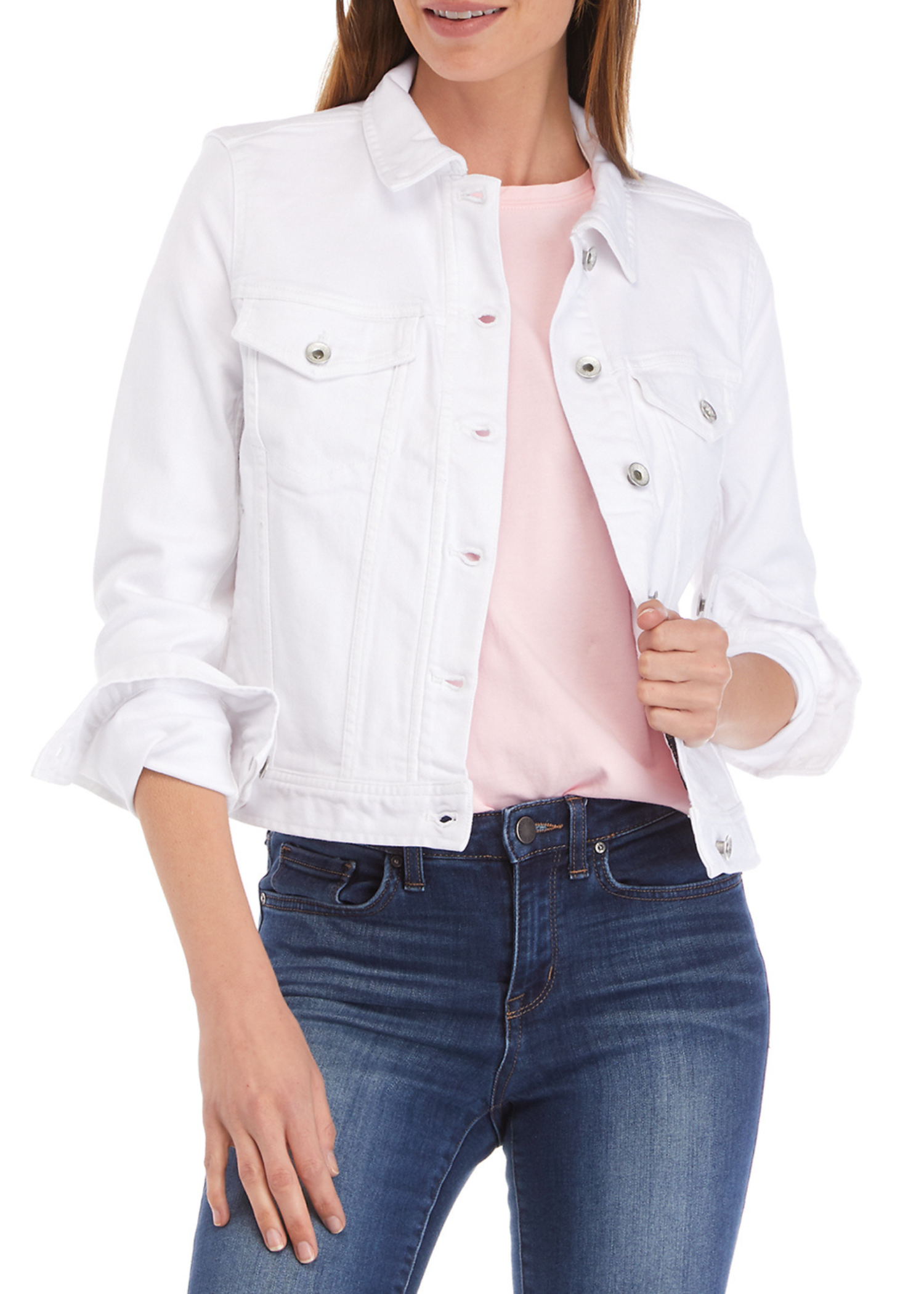 Embellished with a preppy collar, this white denim jacket. It's finished with buttoned cuffs and chest flap pockets.