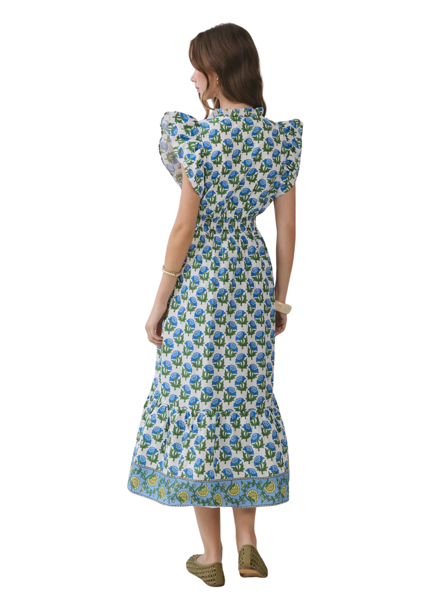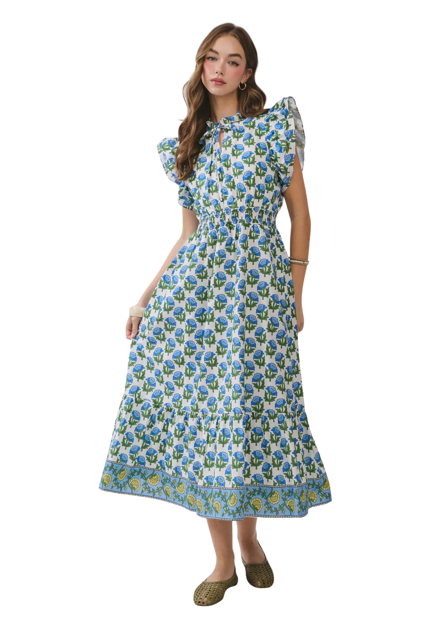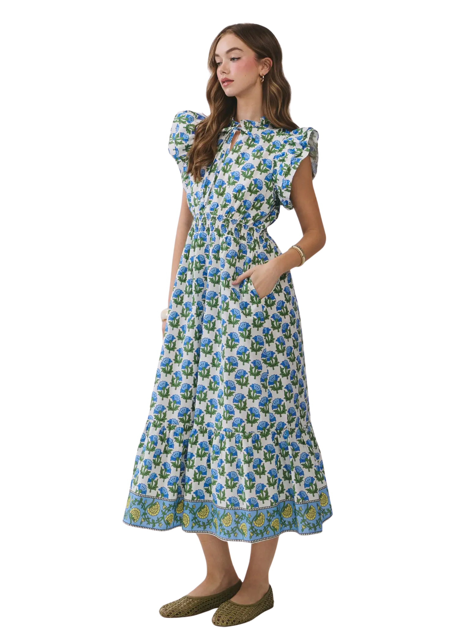 This floral print midi dress features a ruffled neckline with a front tie detail. Designed with flutter sleeves, side pockets and a smocked waist for a flattering fit and finished with a tiered skirt and contrast border detailing.