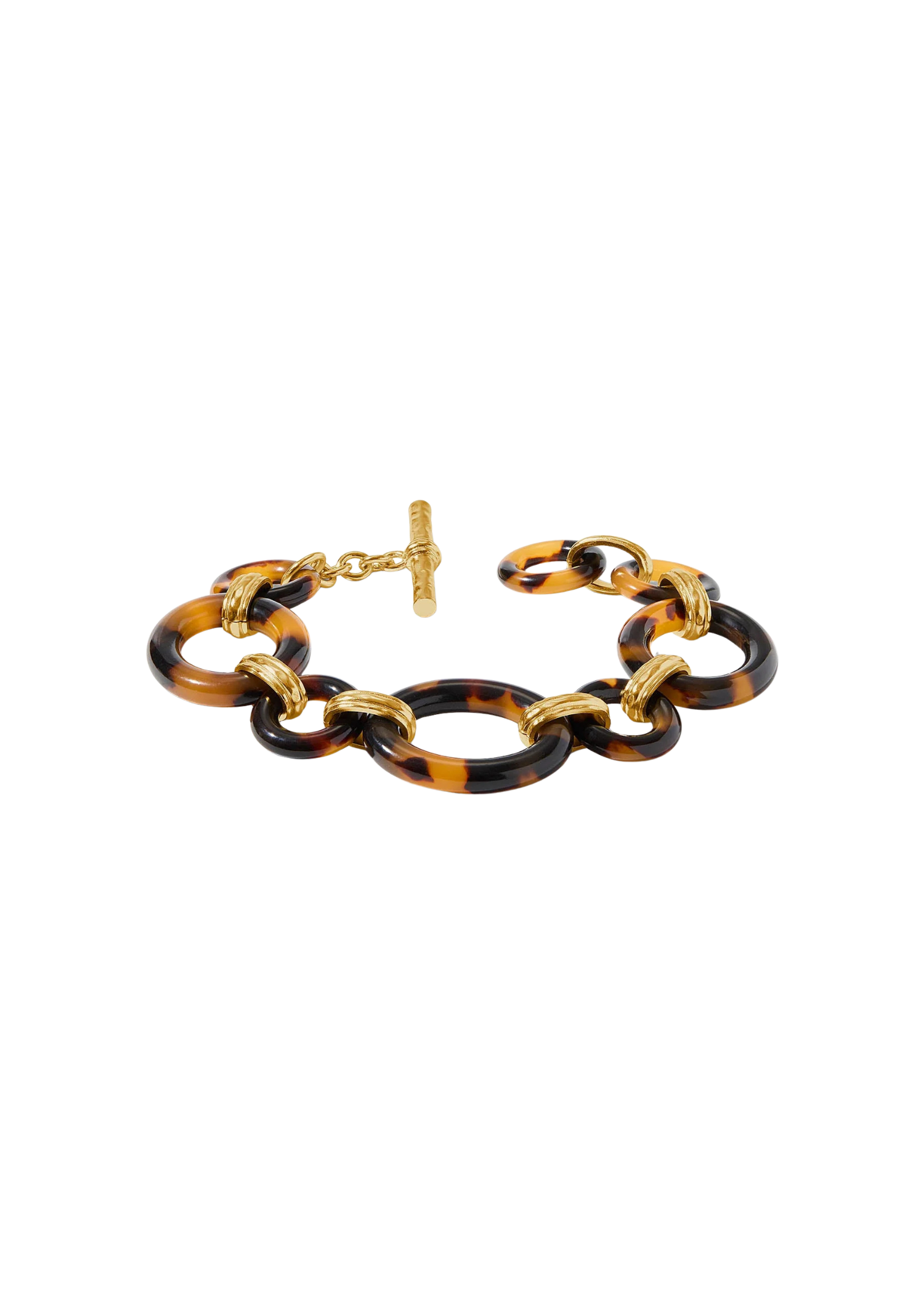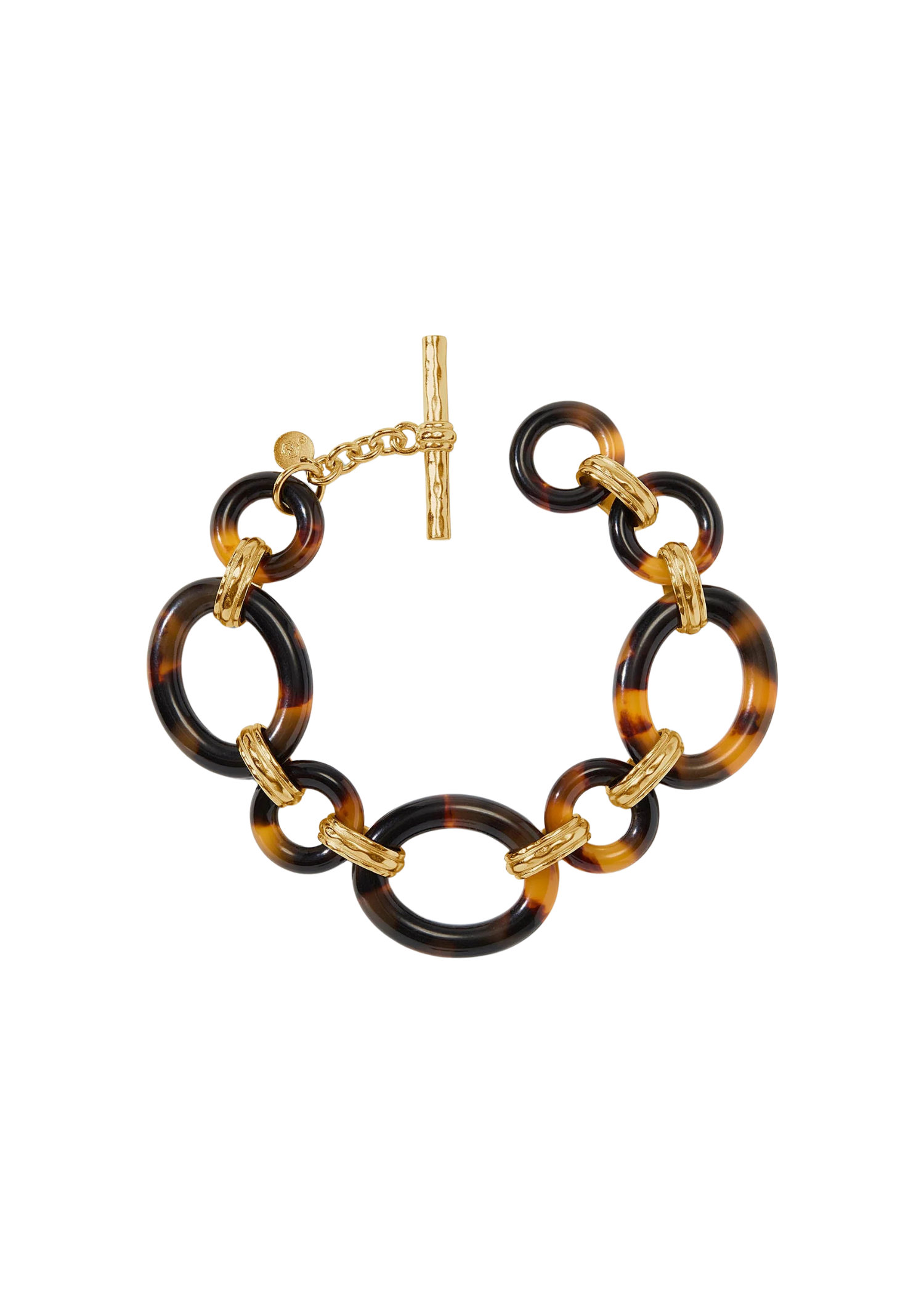 Ovals and rings made from polished translucent tortoiseshell alternate with lightly hammered golden links and close with a matching gold toggle.
