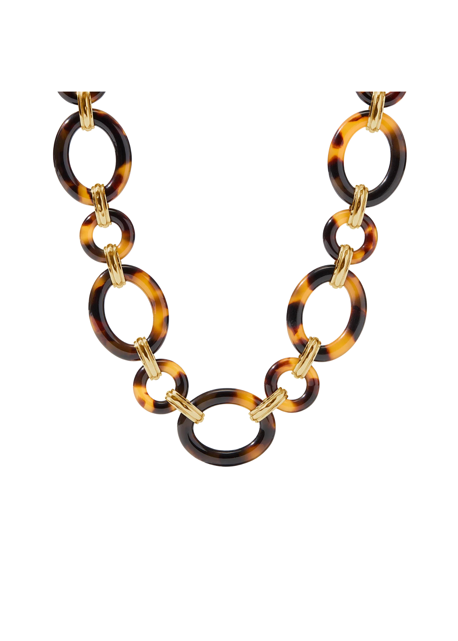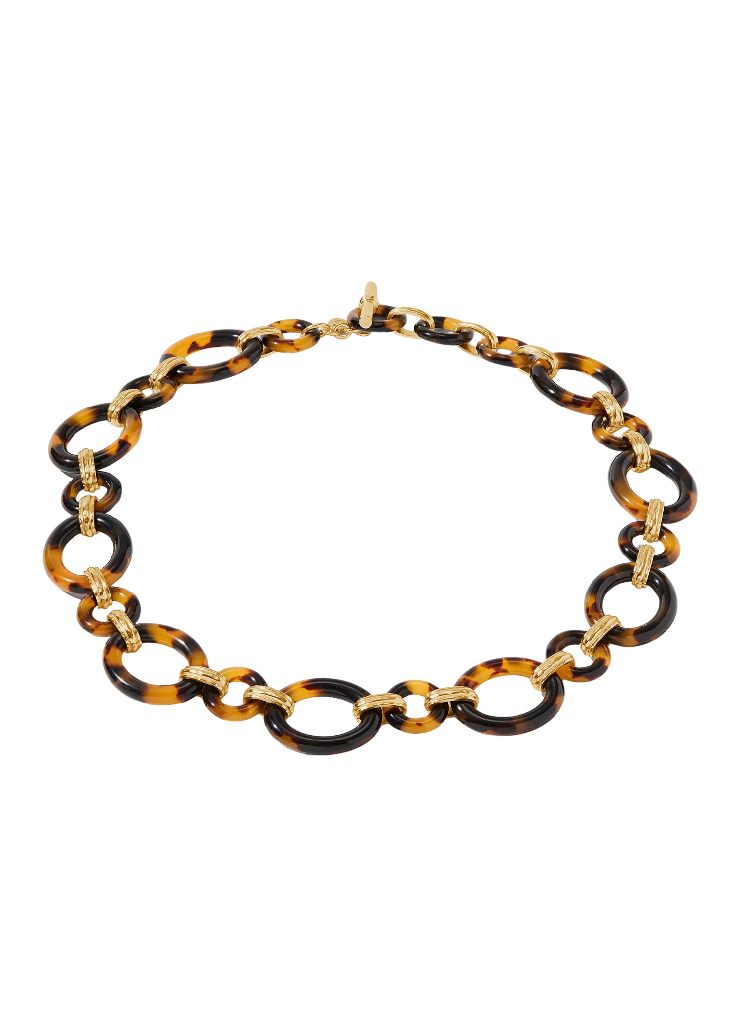 Ovals and rings made from polished translucent tortoiseshell alternate with lightly hammered golden links and close with a matching gold toggle.