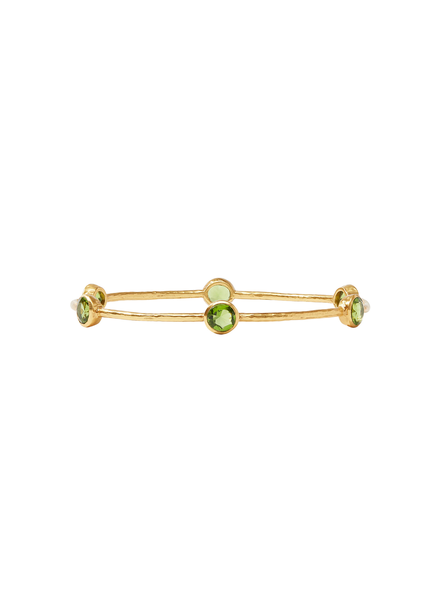 A lightly hammered bangle embellished with six sparkling gemstones.