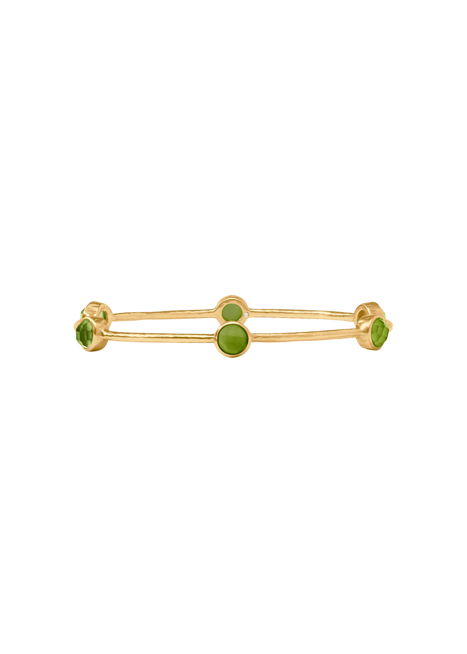 A lightly hammered bangle embellished with six iridescent gemstones.