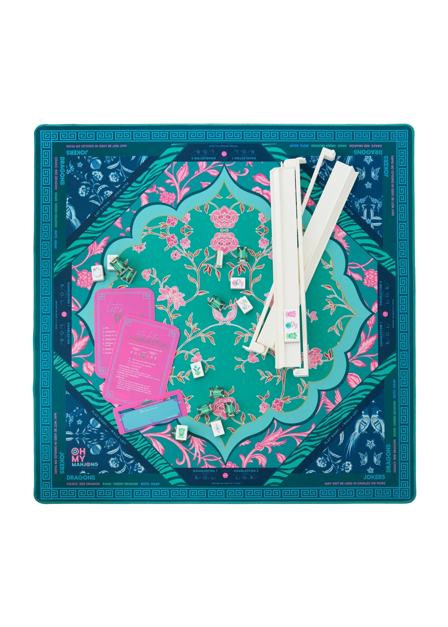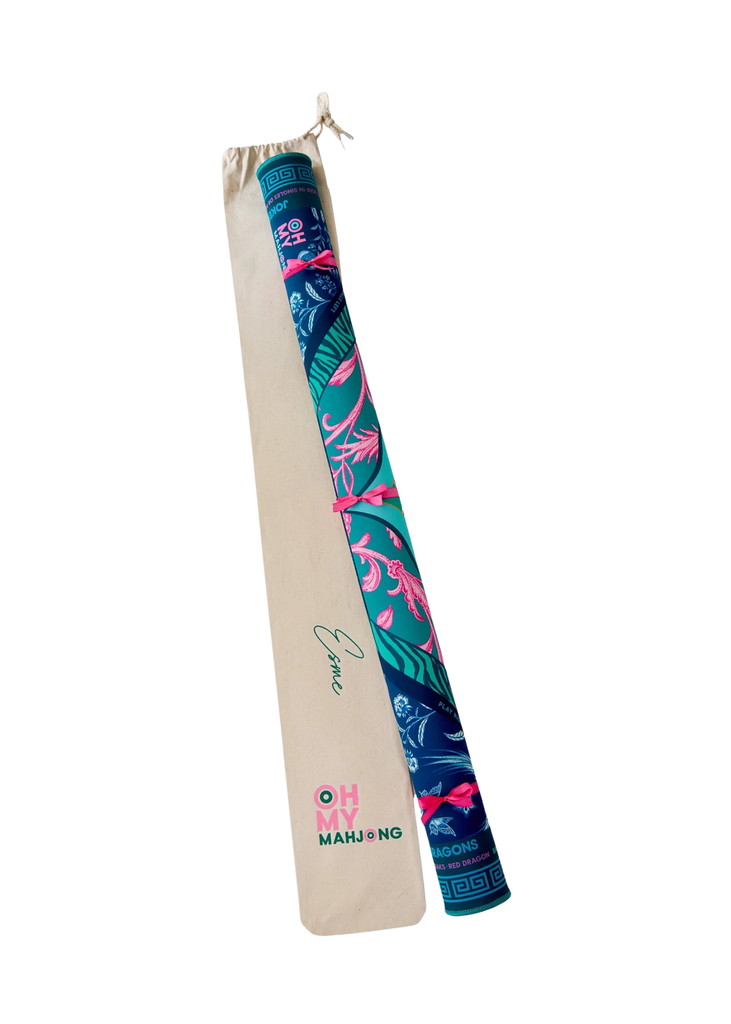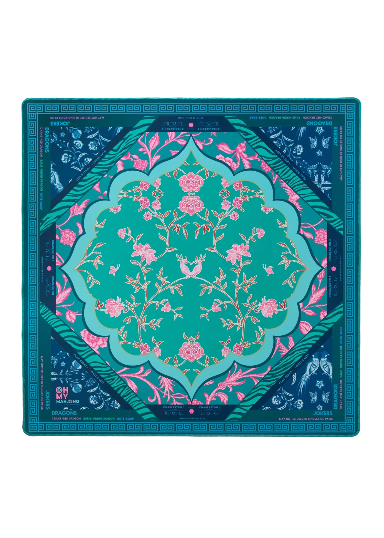 Introducing the Esme Mat — a vibrant, artfully chic addition to your Mahjong setup, designed for those with a love for playful elegance and globally inspired design. Drenched in fresh tones of green, blue, and pink, this mat brings together painterly florals, bold zebra accents, and a classic cane border for a look that’s both spirited and sophisticated. It’s cosmopolitan yet inviting — the perfect marriage of Palm Beach whimsy and timeless heritage charm.