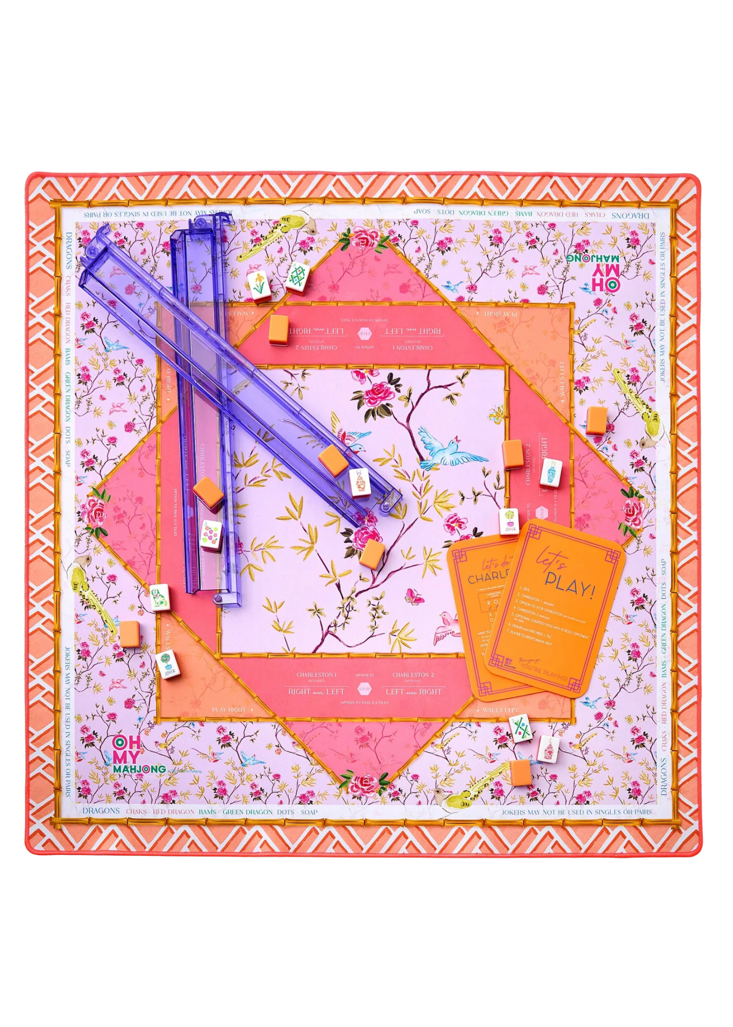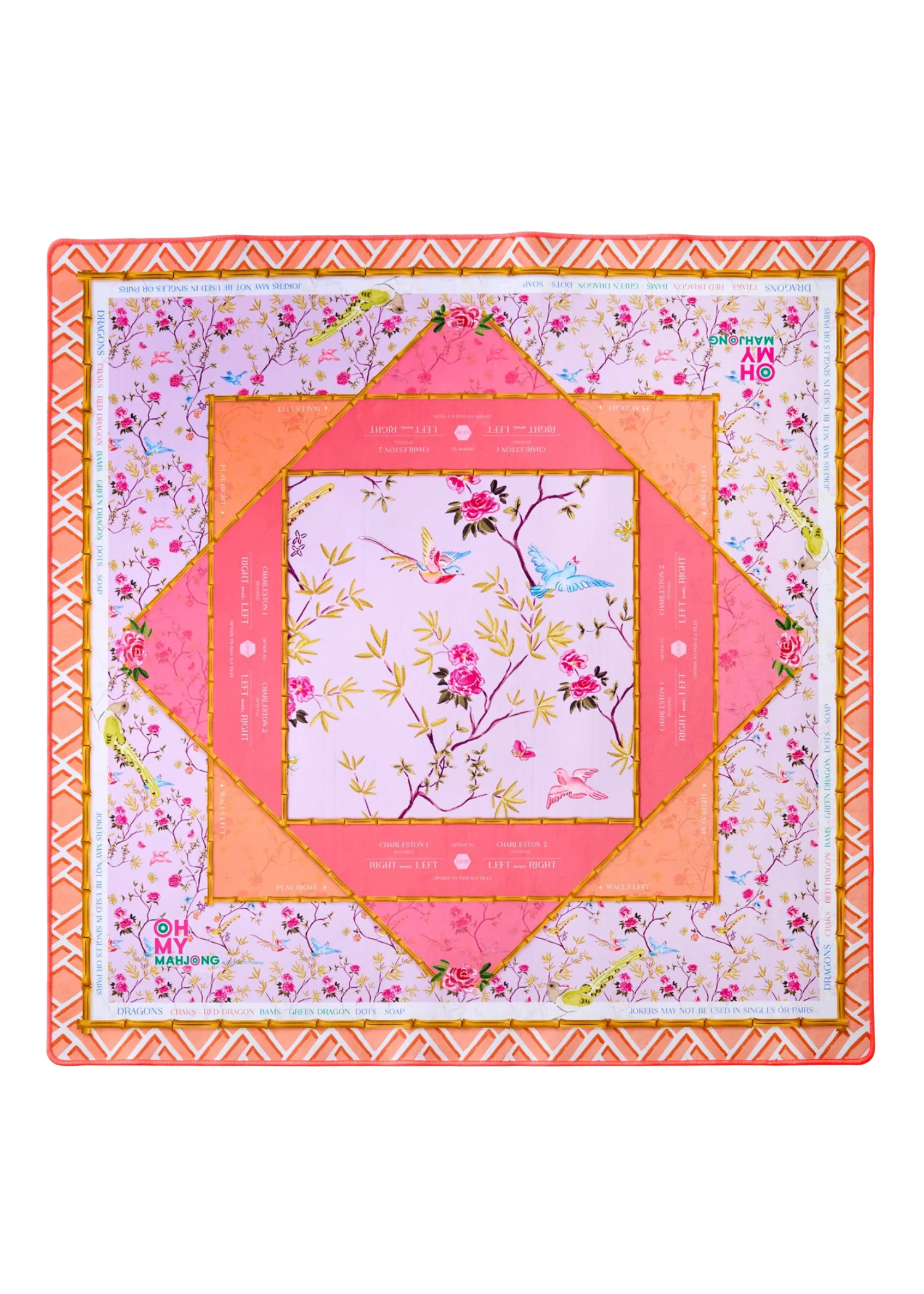 Meet the Goldie Mahjong Mat. This mat captures the warm, golden hues of a perfect sunset, paired with radiant pink and coral tones to evoke the beauty of evening light. A bold neon orange border adds an extra pop of playful energy. Goldie’s neoprene construction makes it easy to clean, and its rubber non-slip backing keeps it firmly in place. Instructional reminders along the edges make gameplay elegant and effortless, while its bold design adds a touch of warmth to any game night.