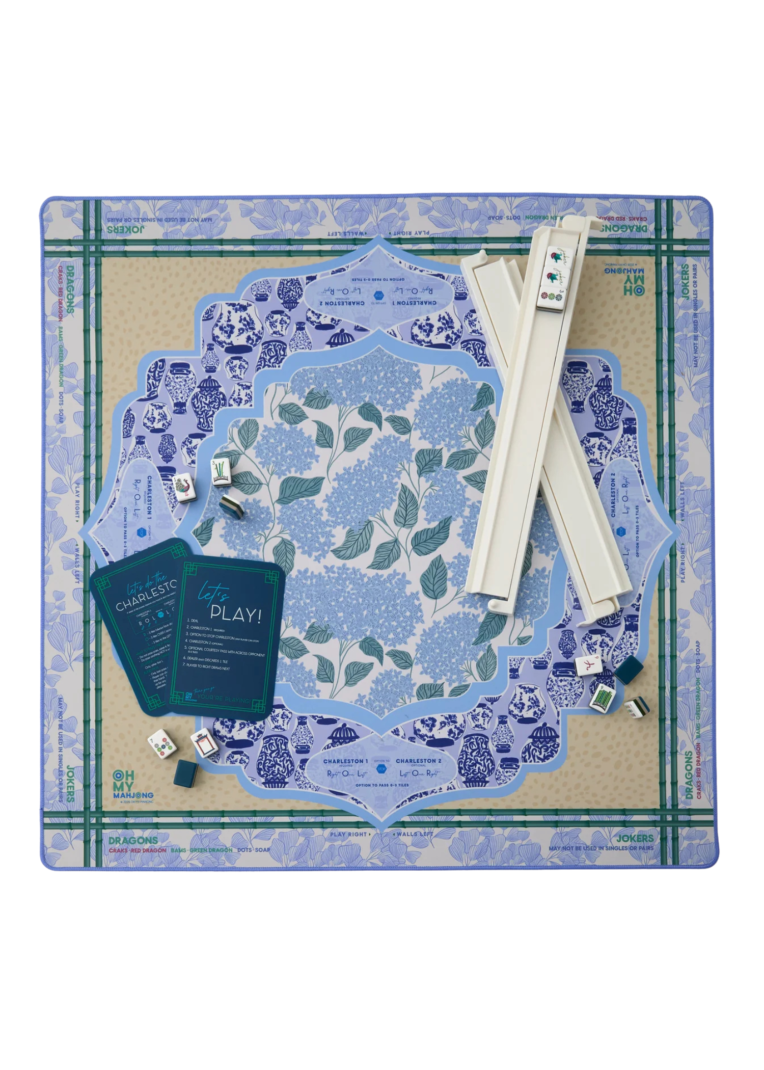 Introducing the Luna Mat — a serene yet statement-making addition to your Mahjong setup, designed for those who love timeless elegance with an artful twist. Awash in calming shades of blue and green, this mat beautifully blends hydrangea blooms, classic ginger jars, and a subtle antelope print for a look that’s equal parts coastal chic and heritage inspired. It’s sophisticated, layered, and quietly luxurious — the kind of pattern that feels right at home in your garden room, beach house, or candlelit game night setting.