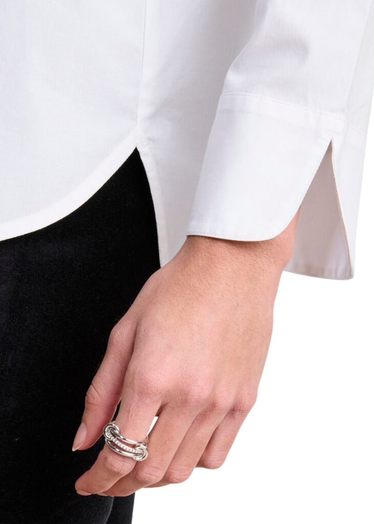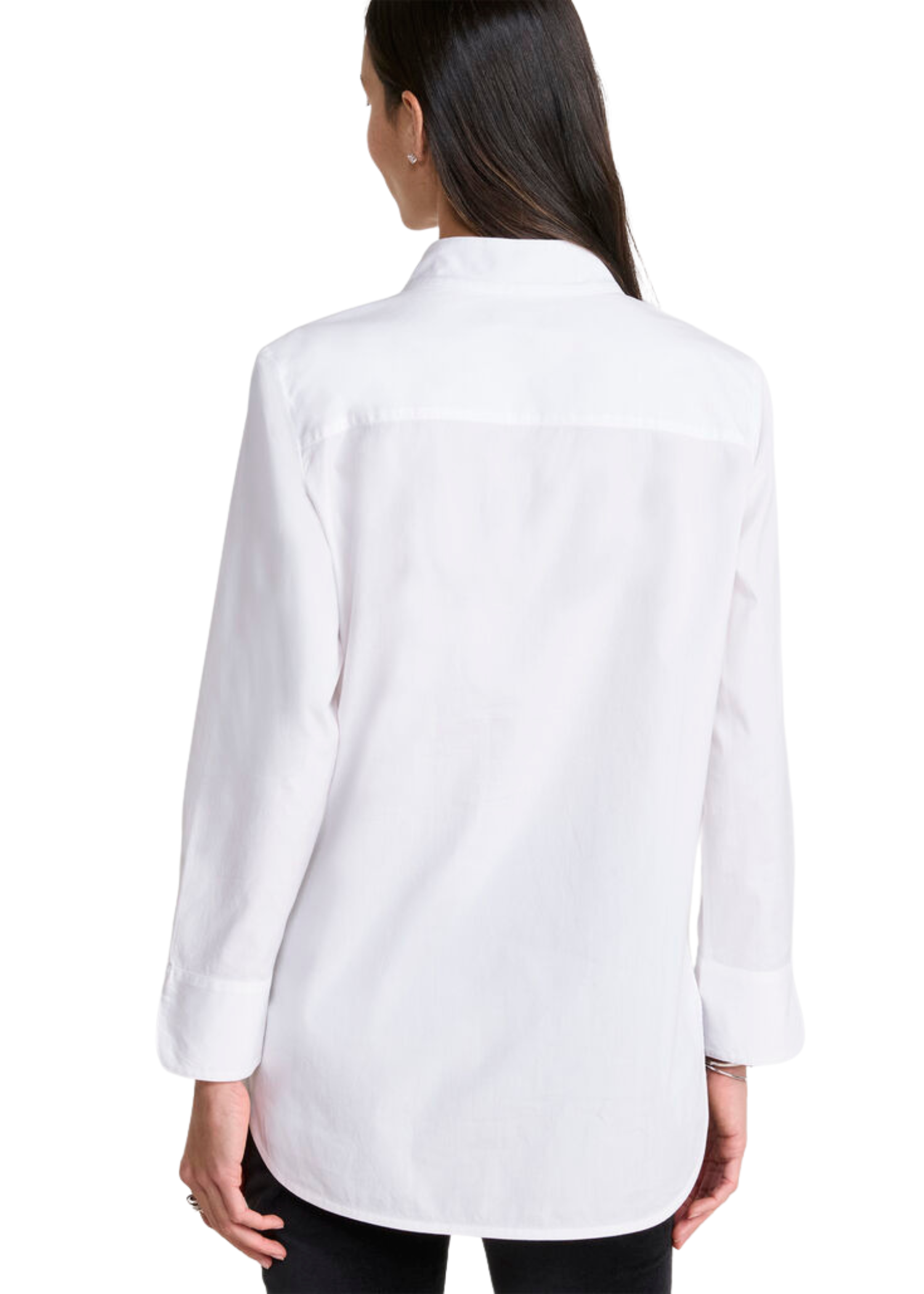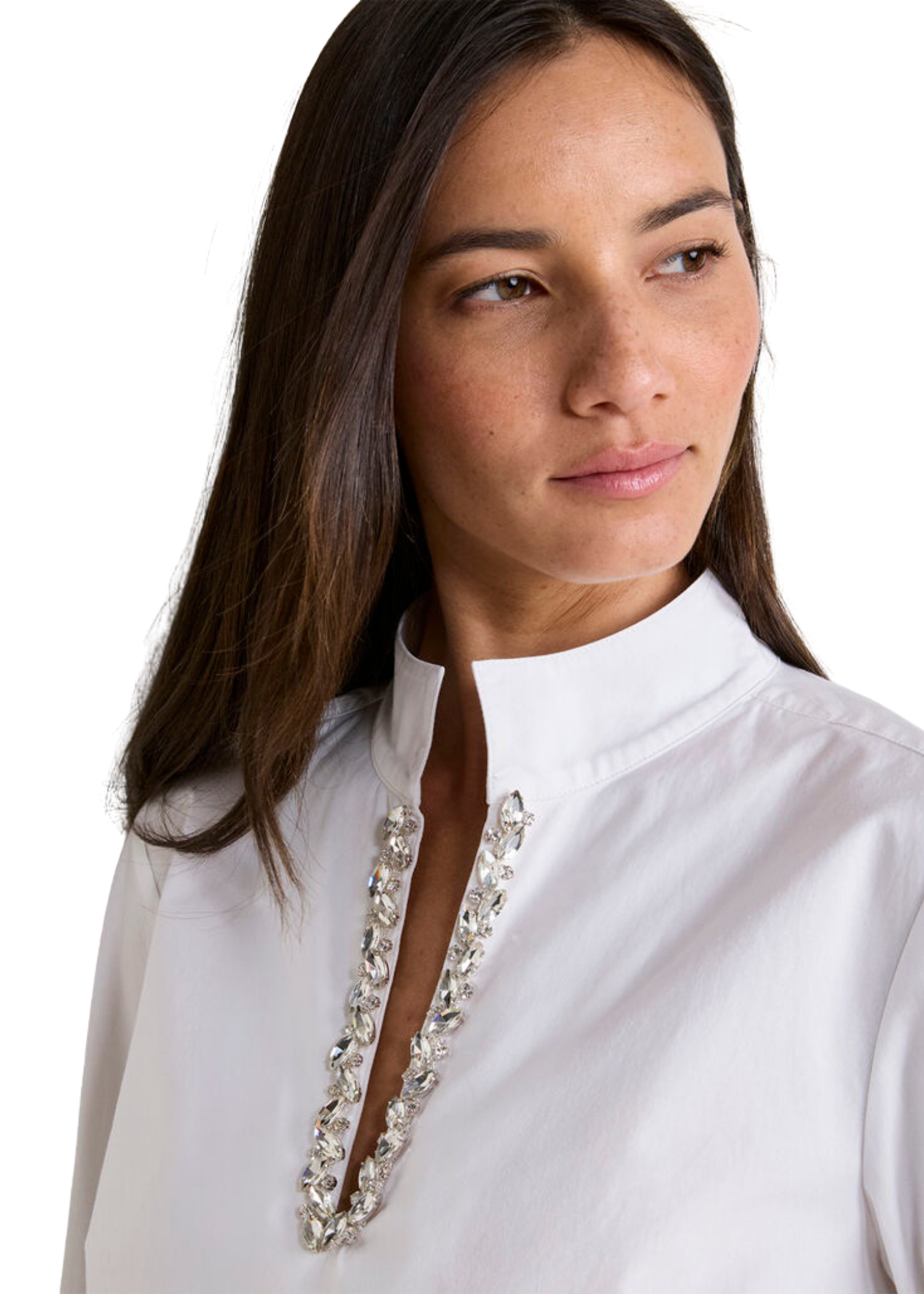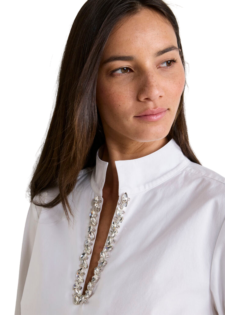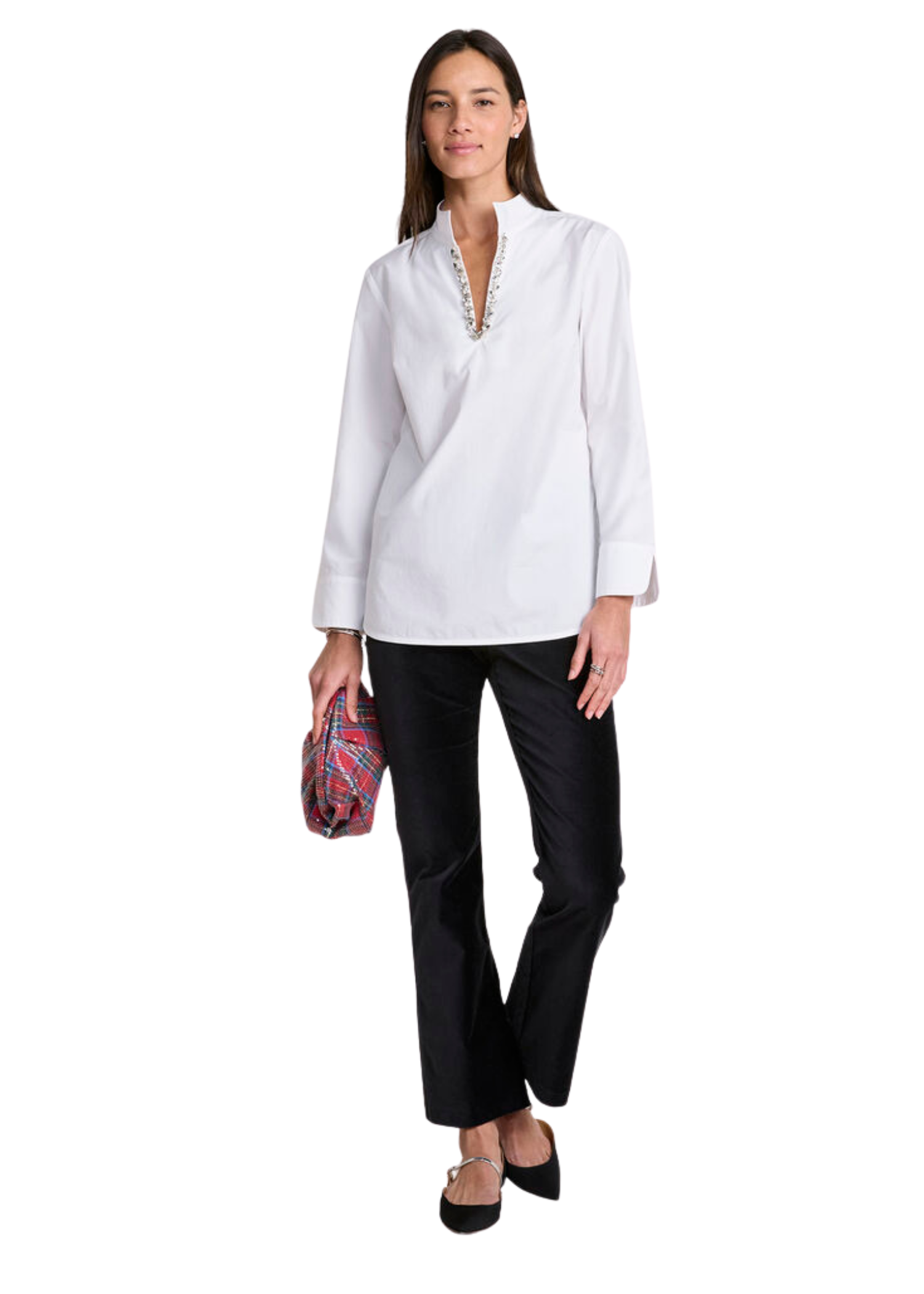 Chic and sophisticated, this flattering tunic-lenth top features a stand-up collar with sparkly rhinestone details around the neck and sleeve cuffs that can be flipped up to add a little extra flair.