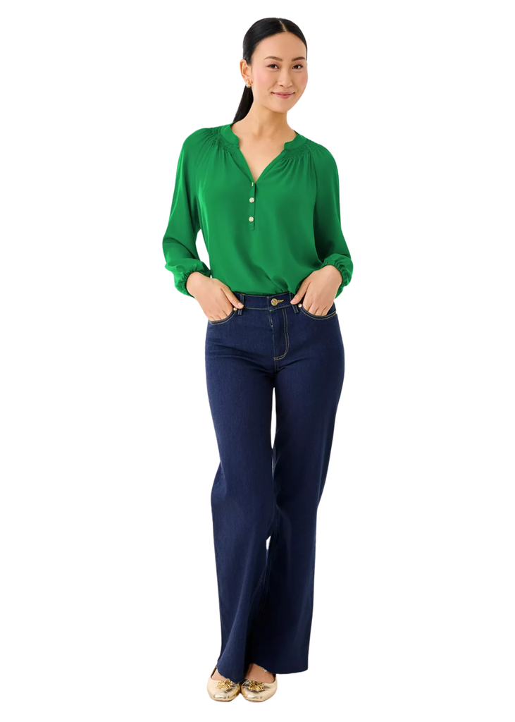 - Easy fit, pullover blouse with gold buttons and bracelet-length sleeves.