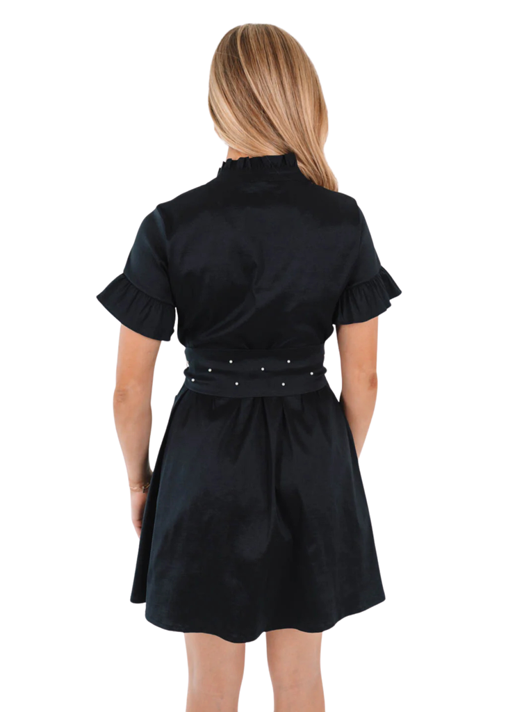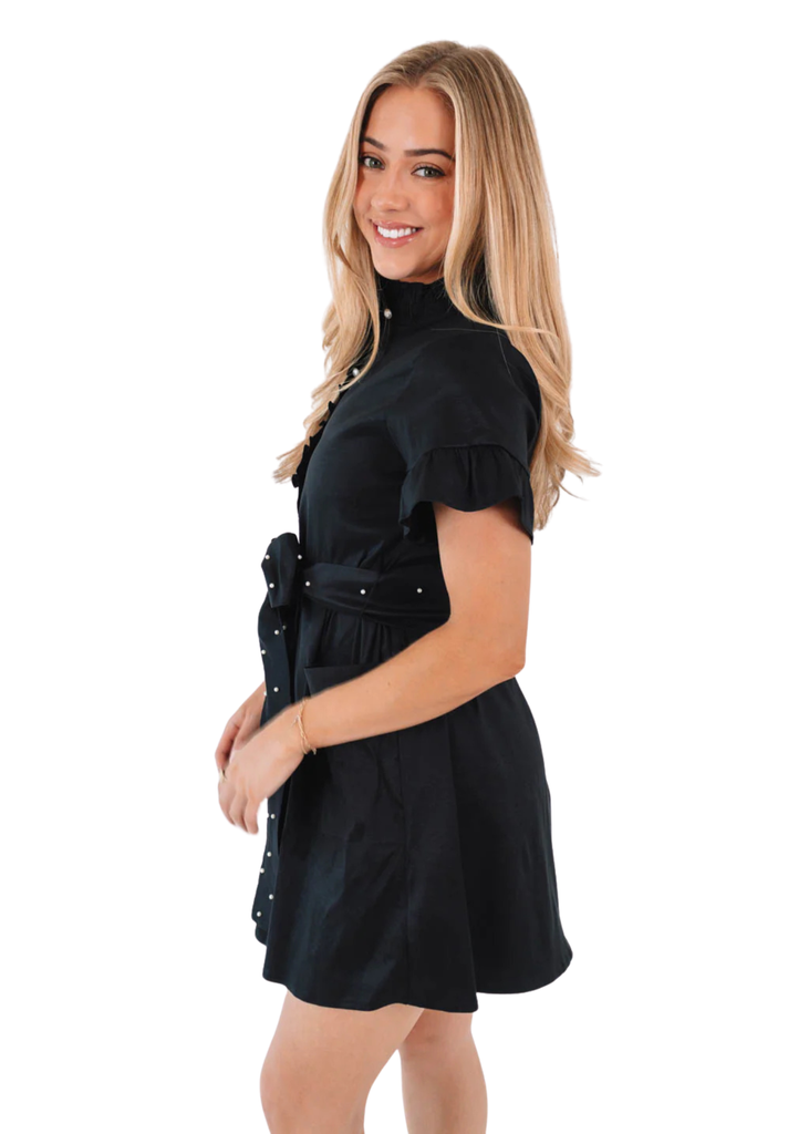 Add a polished touch to your wardrobe with this black dress featuring elegant pearl accents & two front pockets. The button-up neckline & sleek silhouette create a chic, refined vibe - perfect for special occasions or stylish family photos. Pair with your favorite tights & heels for a complete, holiday look!