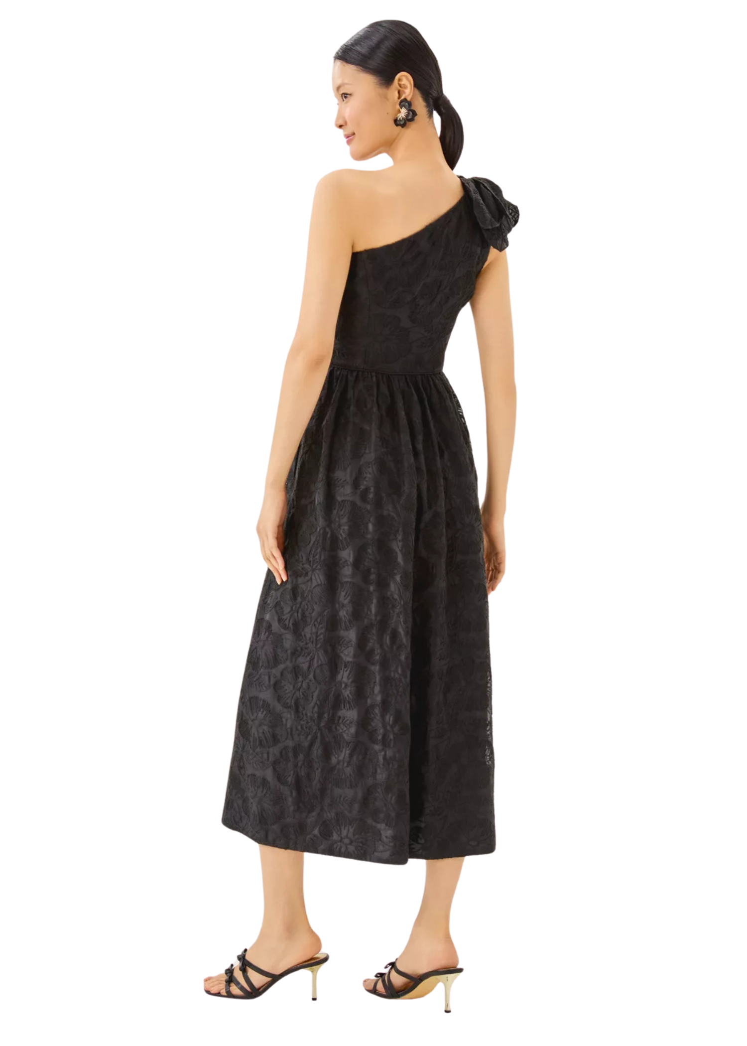 • Fit-and-flare, one-shoulder midi dress with an interior corset, large floral applique at the shoulder, and side seam pockets.