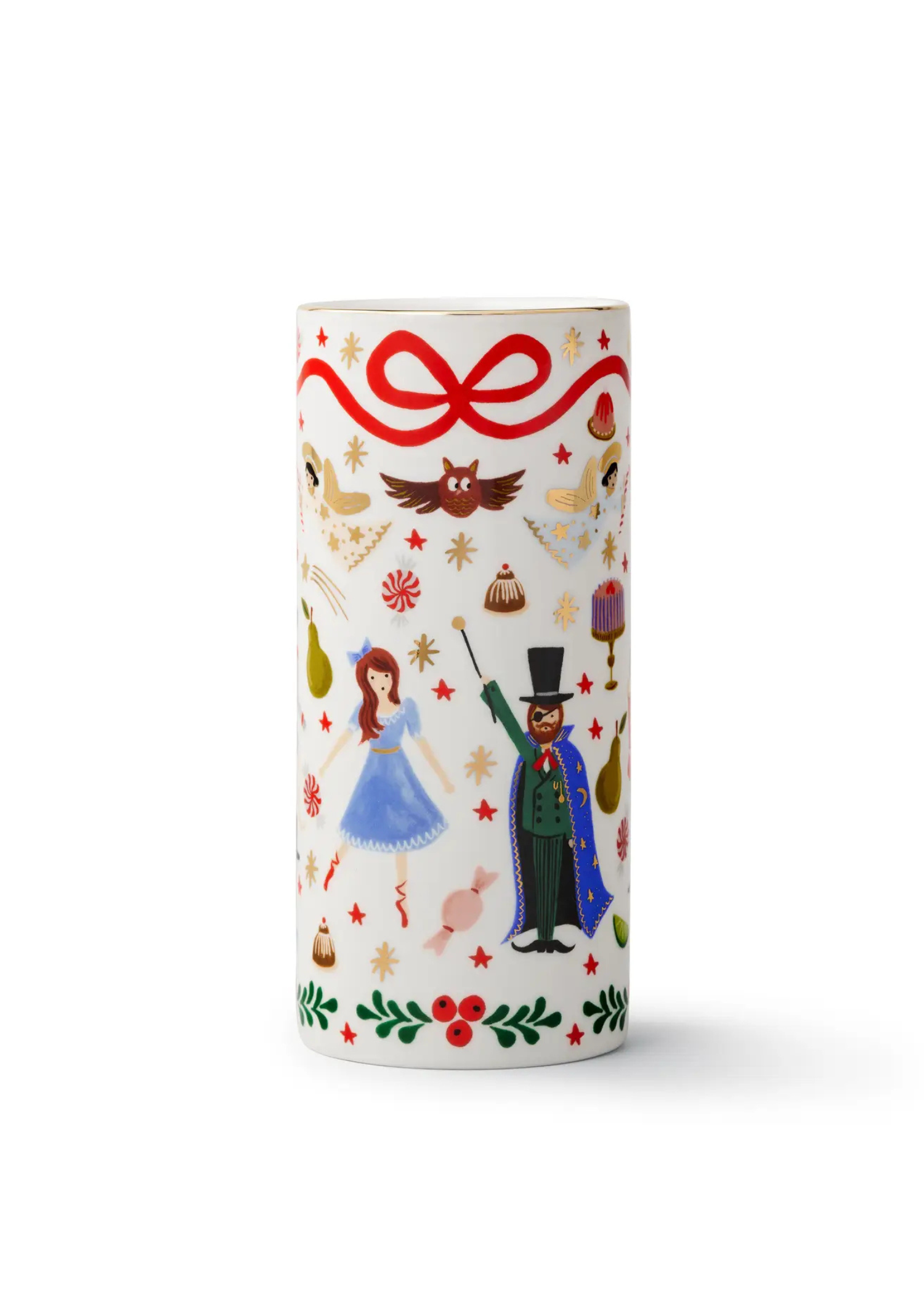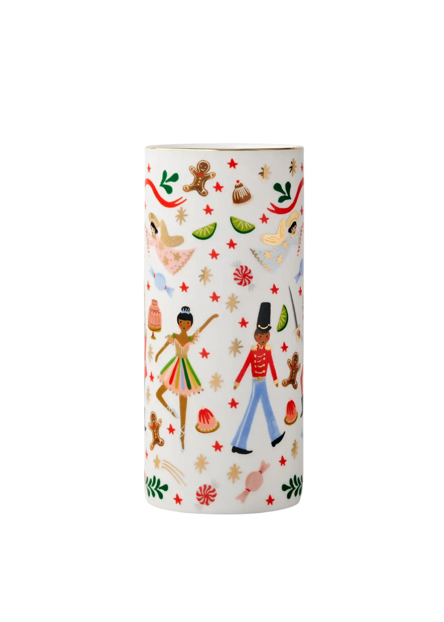 Add a dose of holiday cheer to your winter arrangements. This porcelain cylinder vase features our favorite characters from the classic ballet. Gold foil accents and a gilded rim add extra shine.