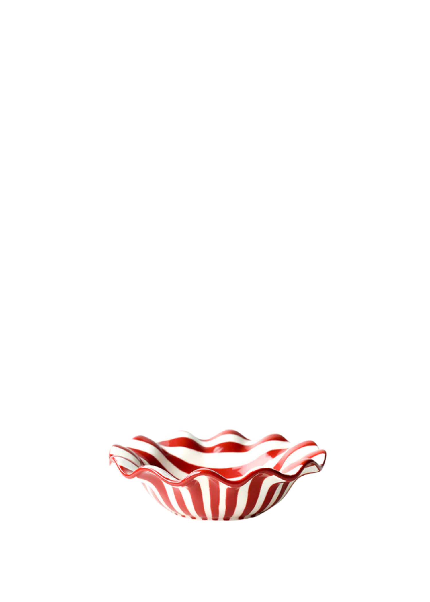The Red Stripe Ruffle Flare Bowl is a unique and versatile dinnerware essential. The red and white striped pattern, ruffle rim, and flare shape create an irresistible design perfect for modern tablescapes. Serve small courses to your loved ones or set it out as a catch-all around the house. Sophisticated and striking, this small bowl is a must-have for any bold host.
