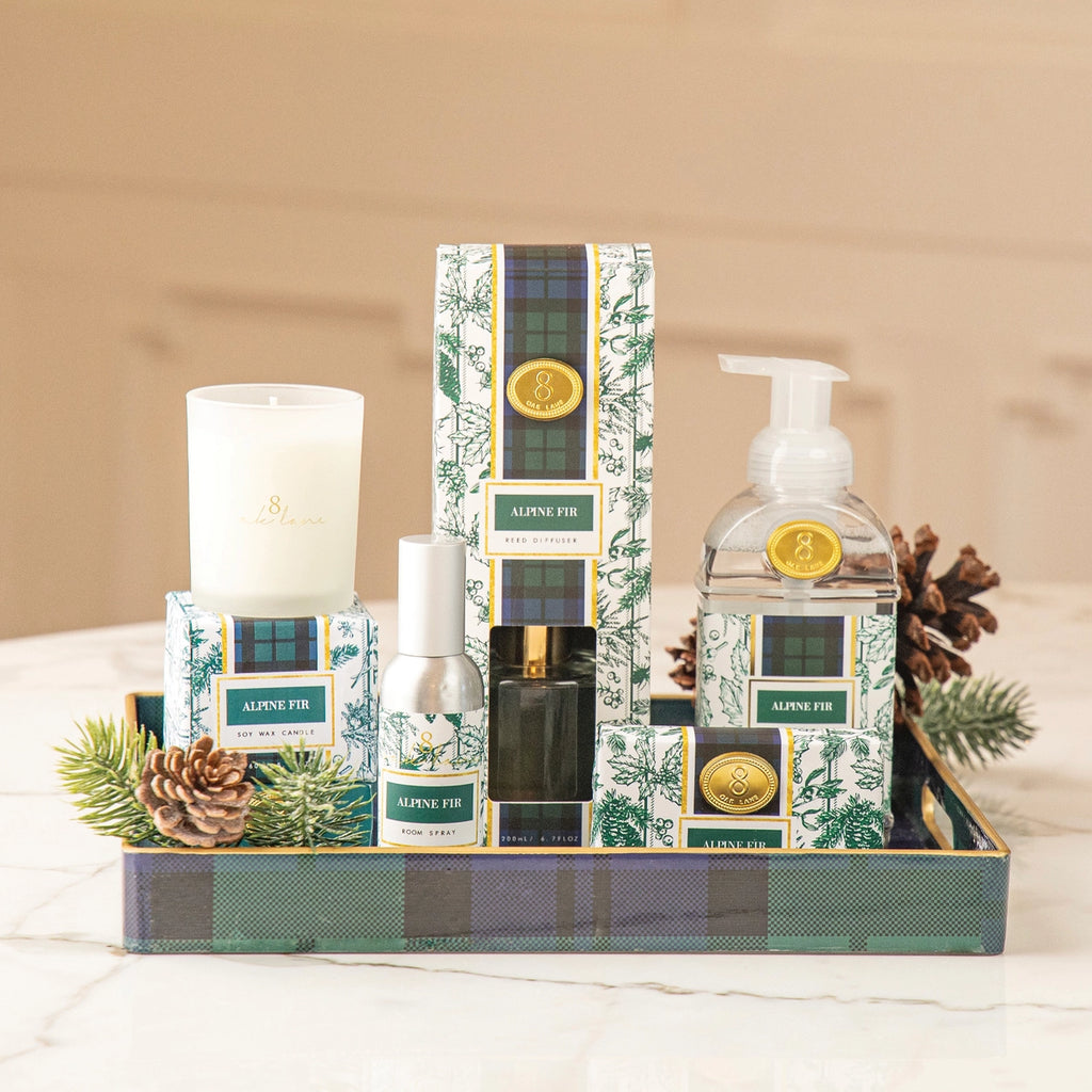 Introducing the enchanting Reed Diffuser in the captivating Alpine Fir fragrance, a delightful blend of spruce, moss & evergreen notes. This Reed Diffuser comes with a glass base as well as plenty of reeds & is exquisitely packaged in a stunning box featuring an intricate alpine fir block print, making it an elegant addition to your home decor or the perfect gift.