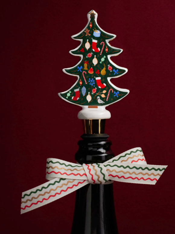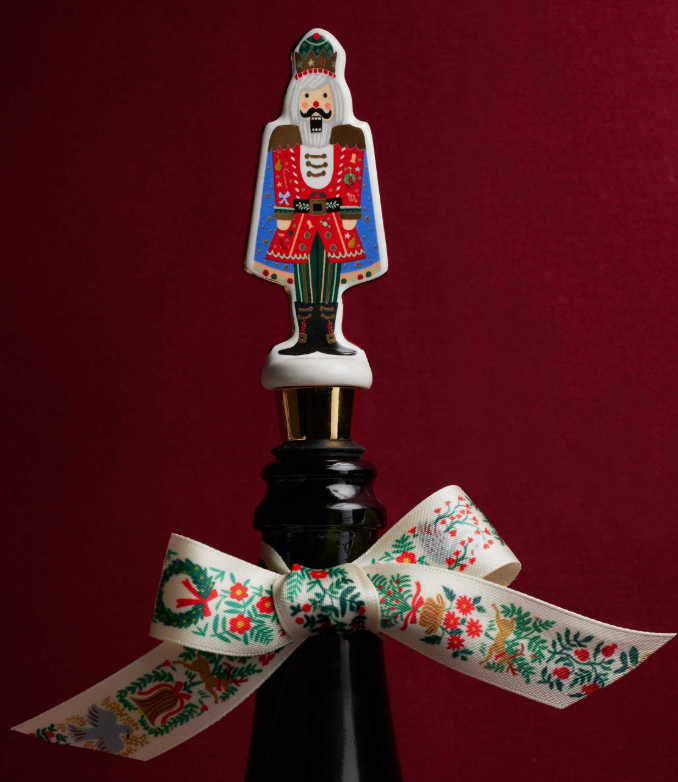 A pretty pair of porcelain wine stoppers, in the shape of a nutcracker and a Christmas tree with illustrated artwork and gold foil accents.