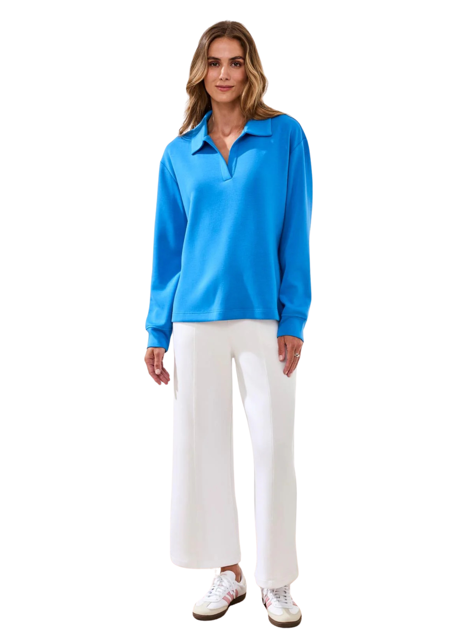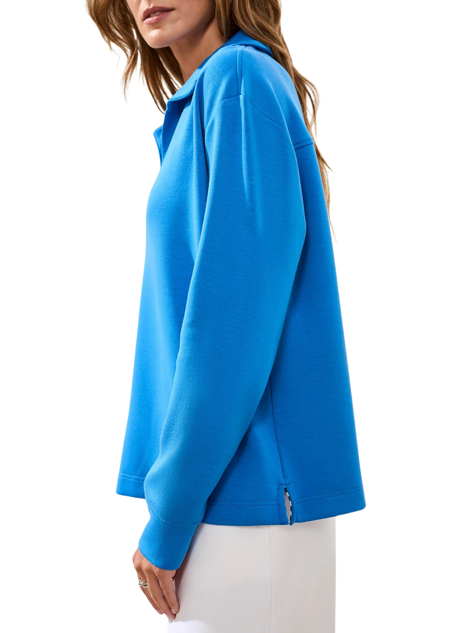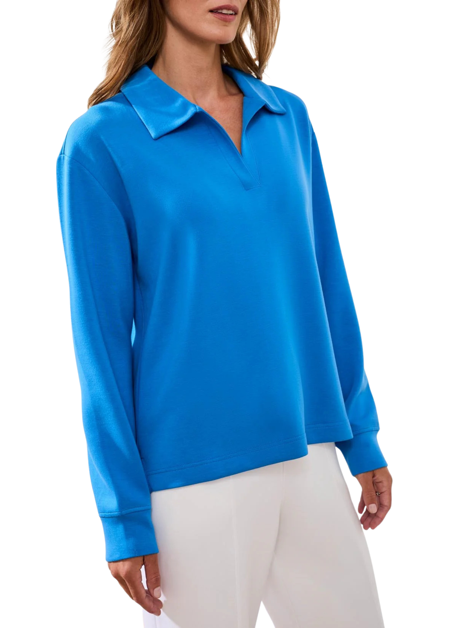 Modern Johnny collar styling and innovative Techno Lux scuba fabric deliver a polished, sporty look in a long sleeve top. Premium stretch, lightweight comfort, and a crisp silhouette make it ideal for active days, travel, or spring layering.
