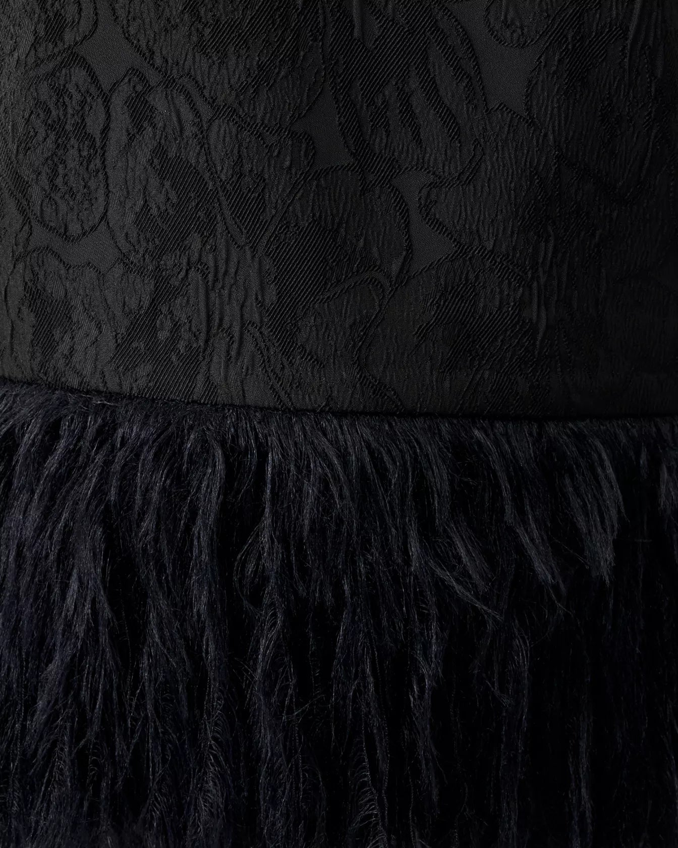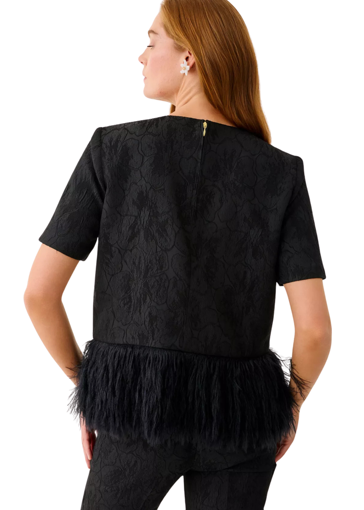 - Straight fit, short sleeve top with a v-neckline and faux feather trim.
