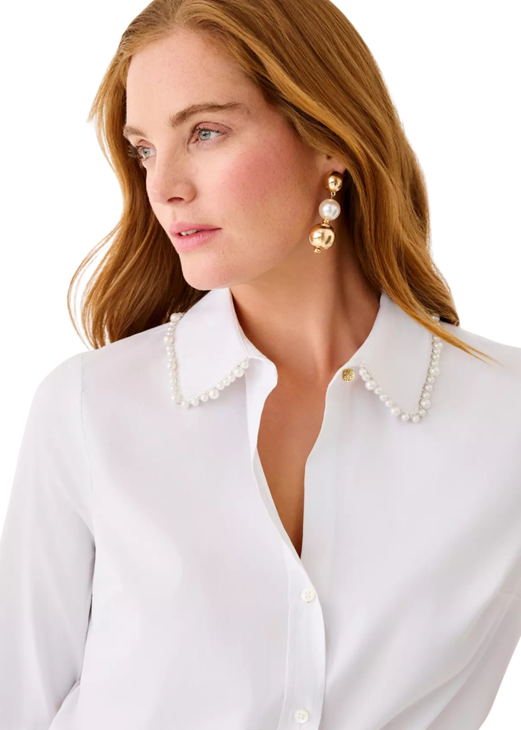 - Straight fit, 3/4 sleeve, button down shirt with pearl details.