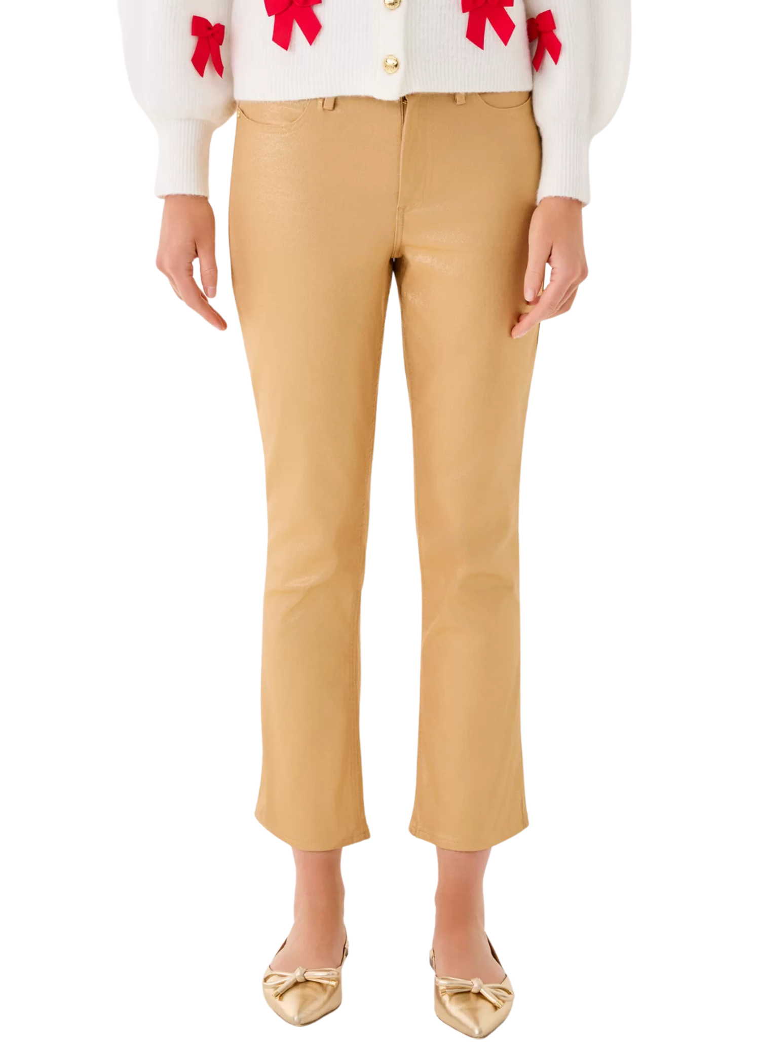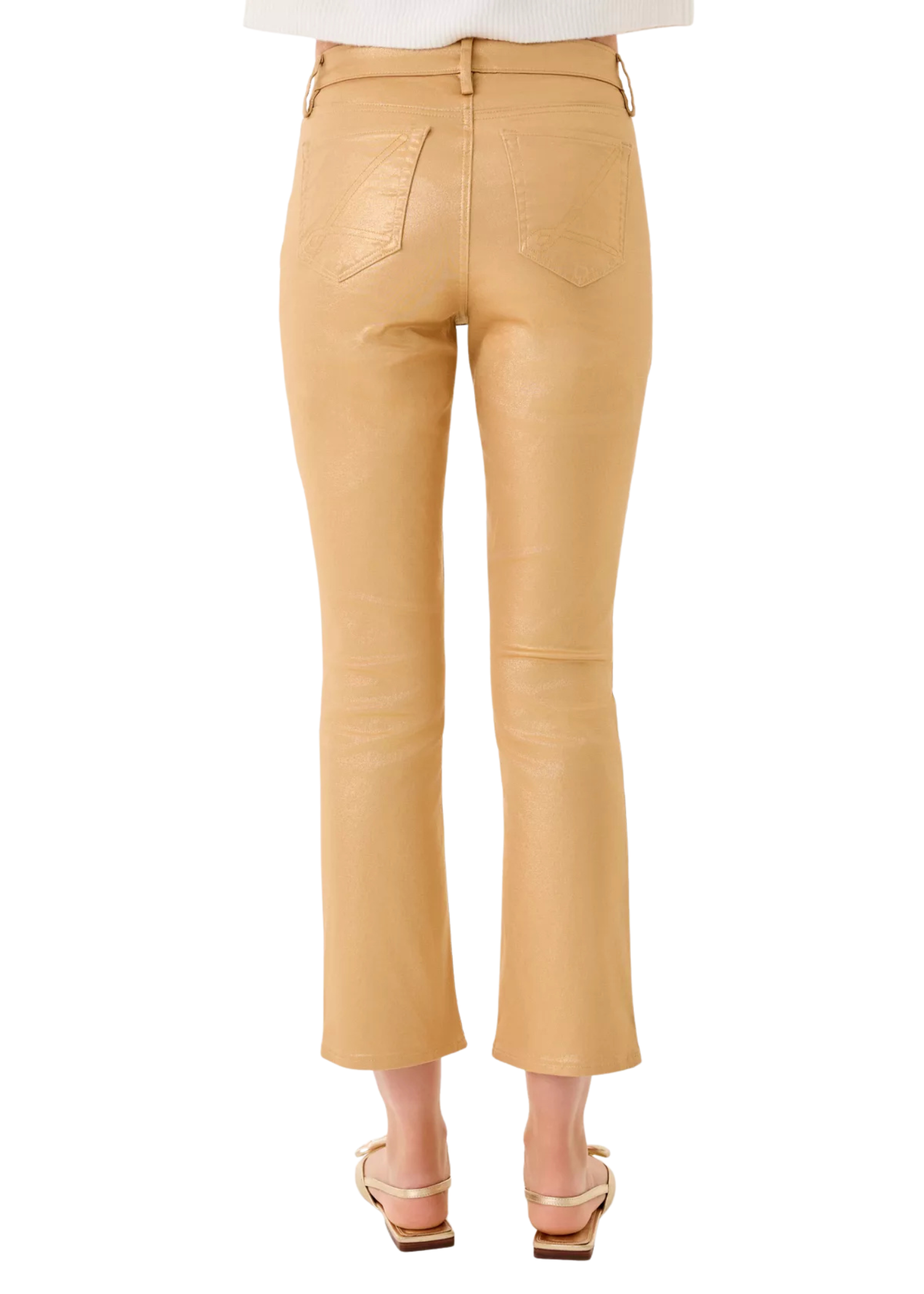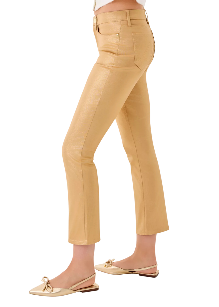 • High rise, crop flare, stretch coated denim jean with a straight fit.