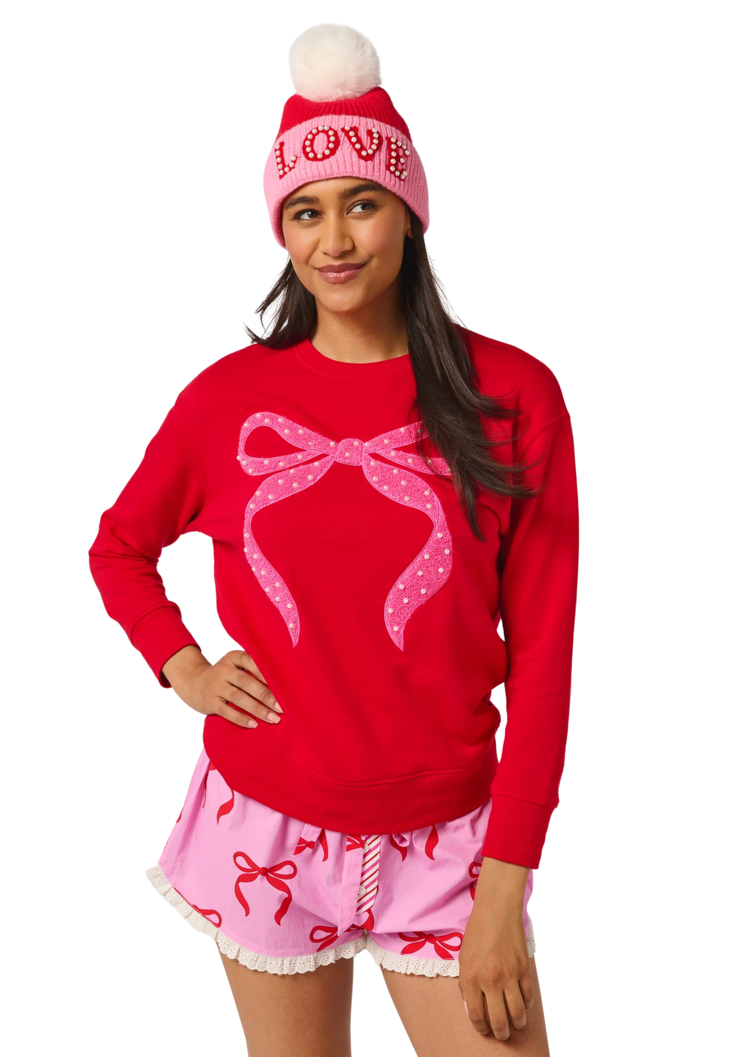 Sweeten up your loungewear with the Bow Boxer Short, a flirty favorite featuring a playful red bow print on soft pink cotton. Designed with a comfy elastic waistband, candy cane-striped drawstring, and eyelet lace trim, these shorts are made for cozy mornings and festive nights. The 1.5" inseam keeps things breezy and relaxed, while the lightweight feel makes them perfect for pairing with your go-to sweatshirts.