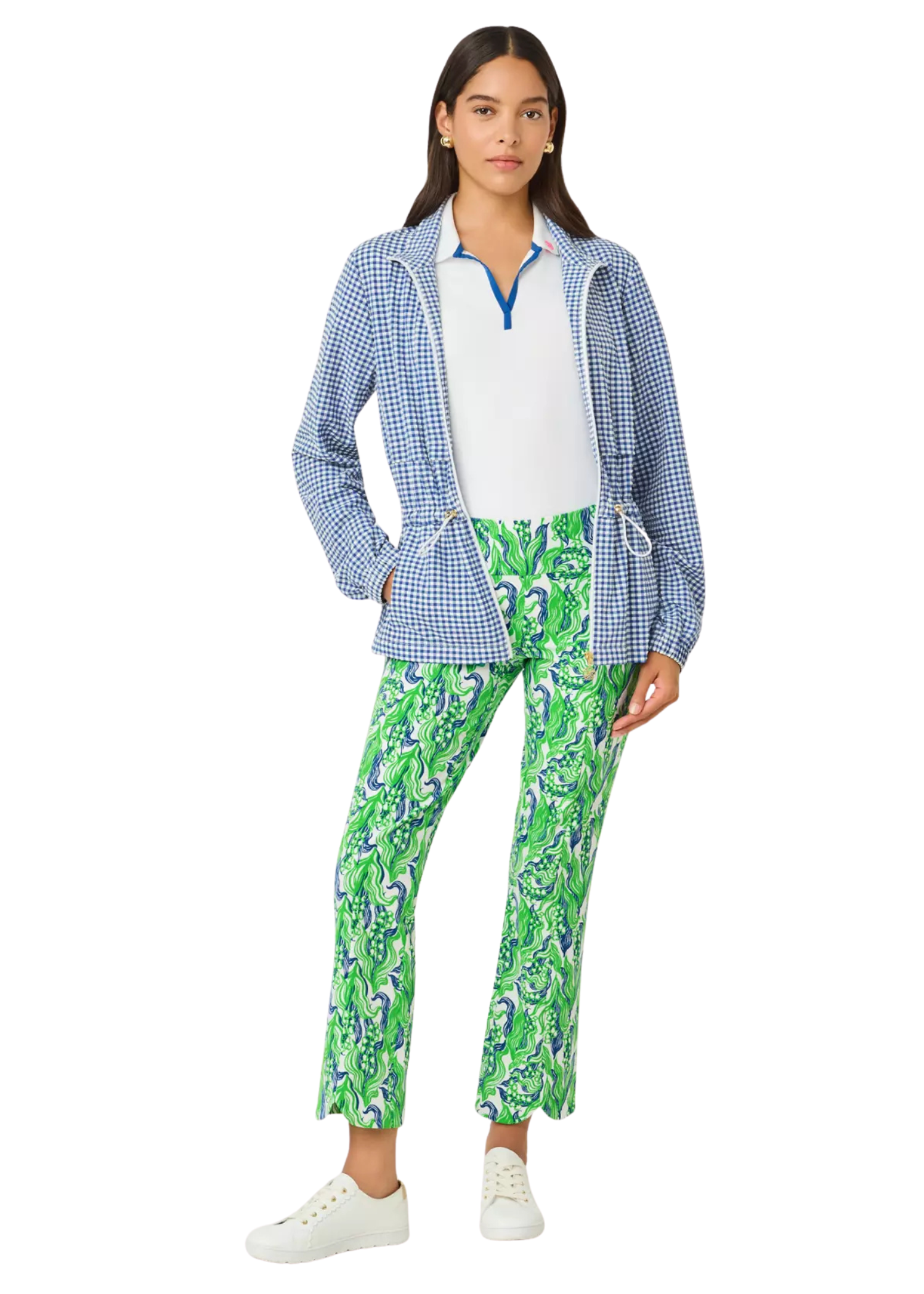 - Mini Performance Gingham (55% Polyester, 39% Nylon, 6% Spandex).