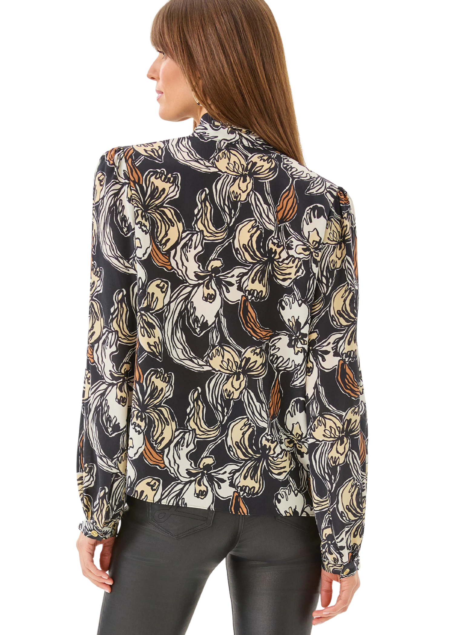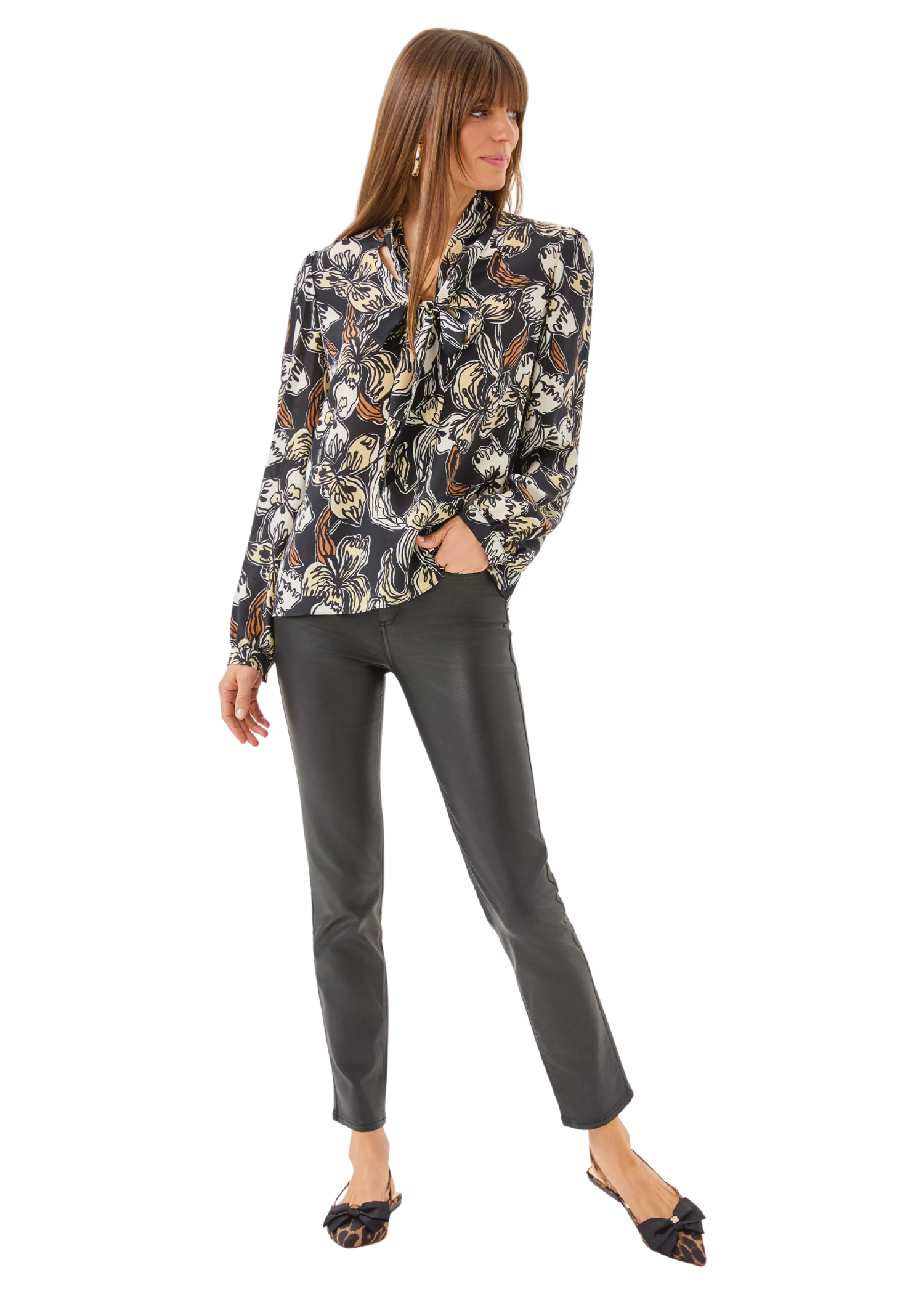 - Straight fit, v-neck, long sleeve top with a scarf bow neck detail.