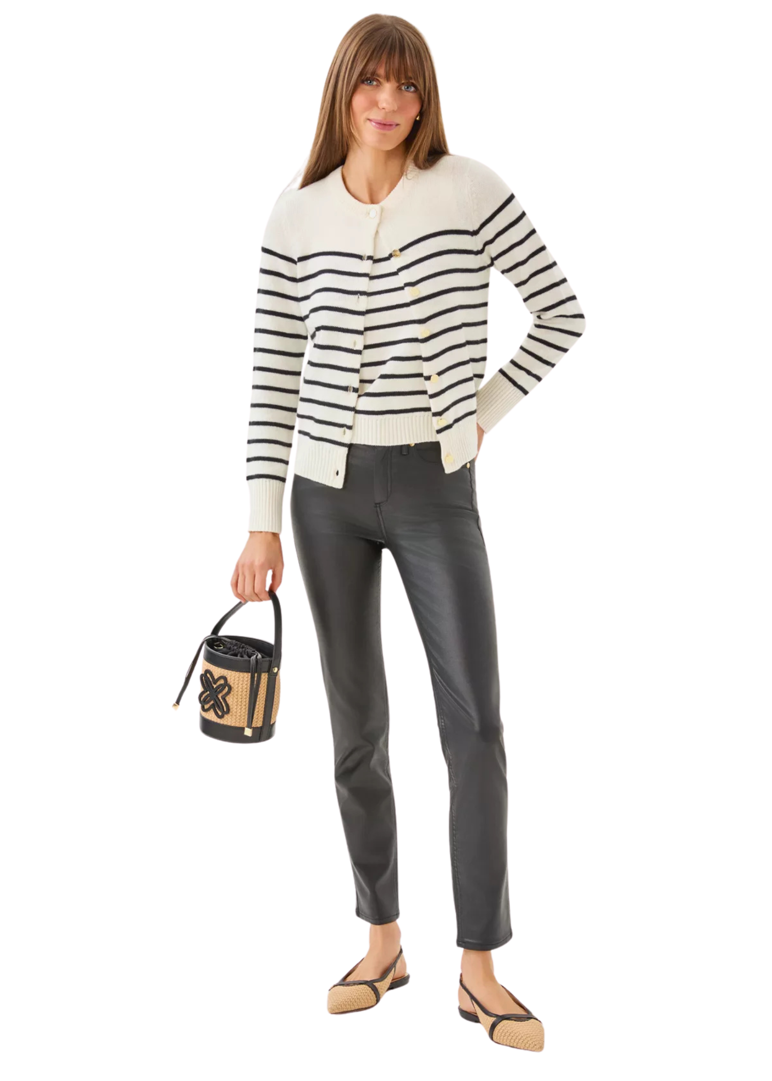 - Striped, crew neck cardigan with buttons and a matching crew neck shell.