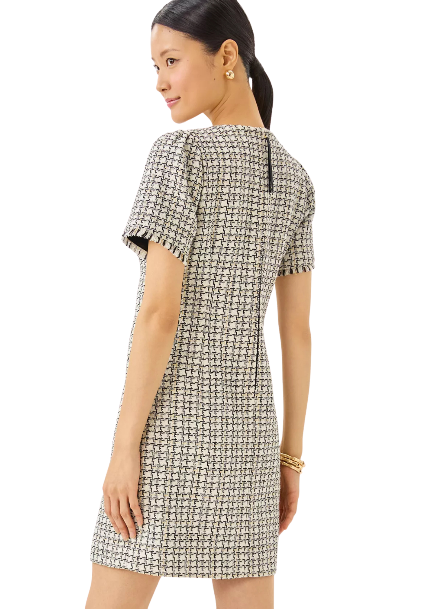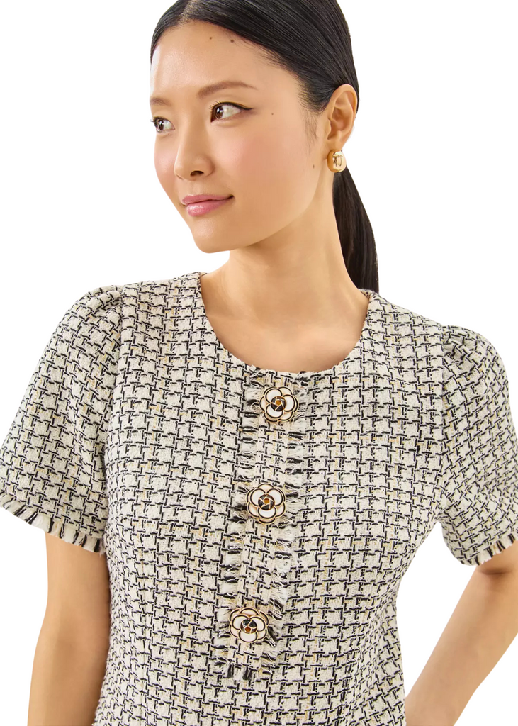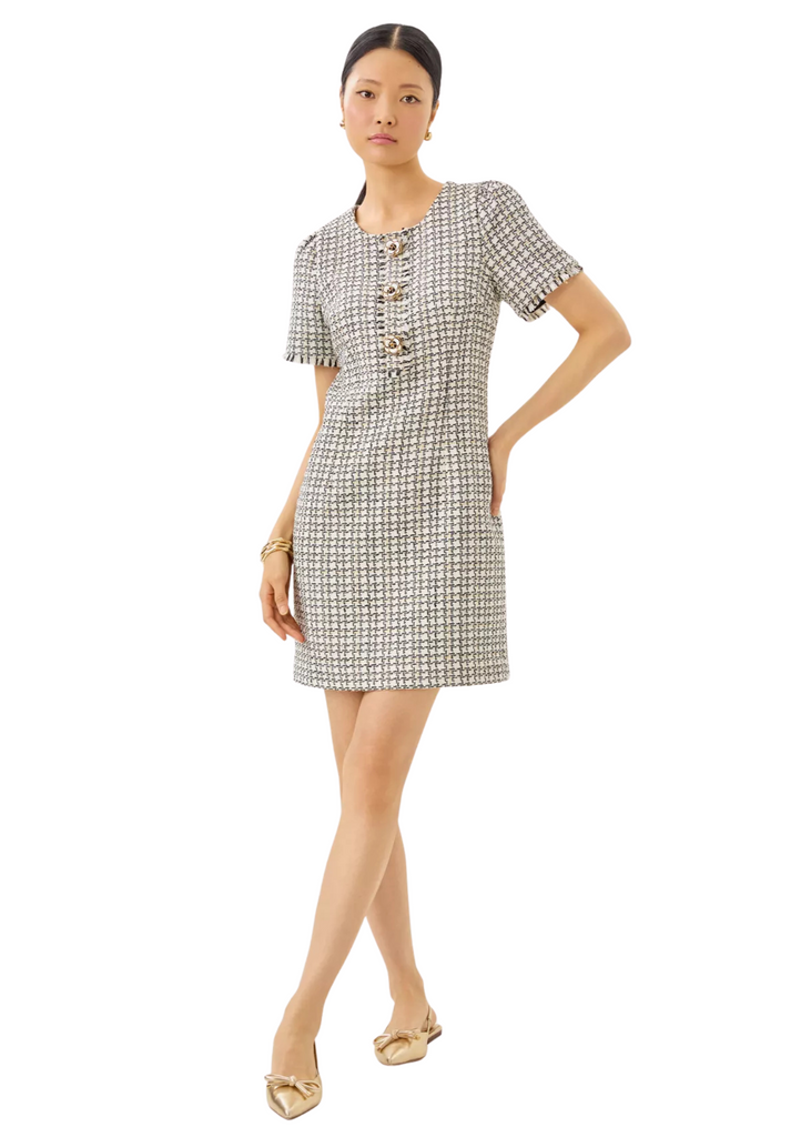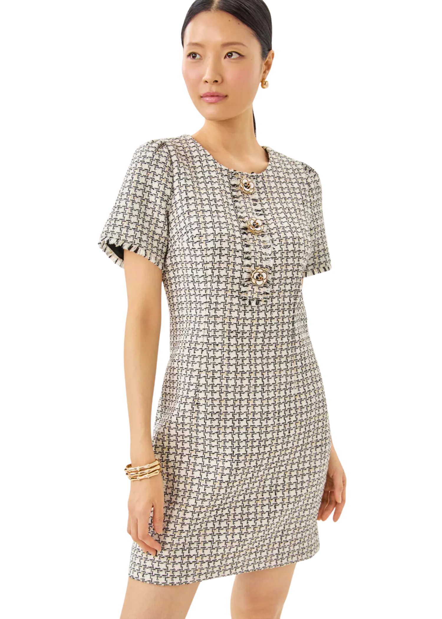 - Straight fit, short sleeve shift dress with a crew neckline, novelty buttons, and self fringe trim.