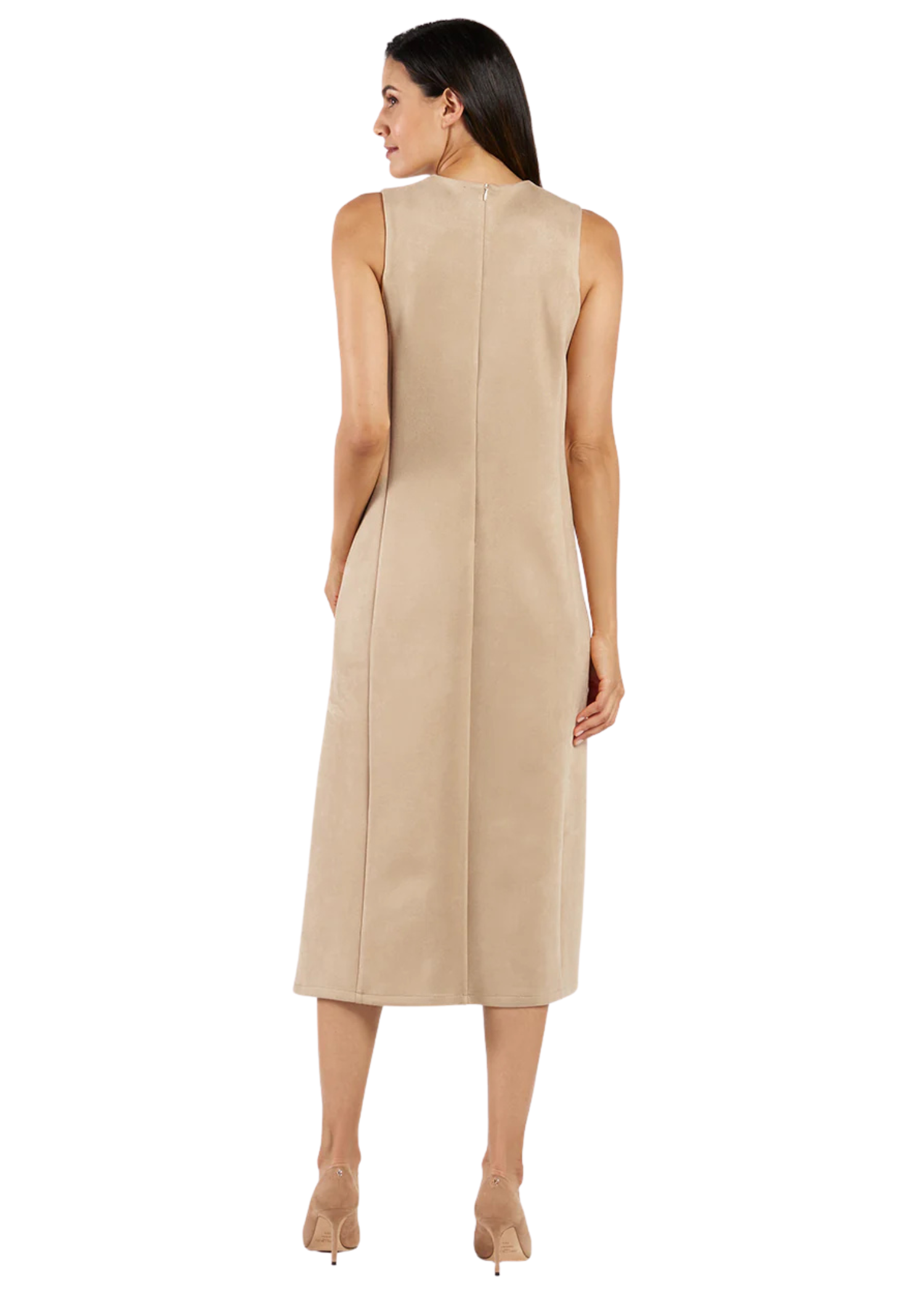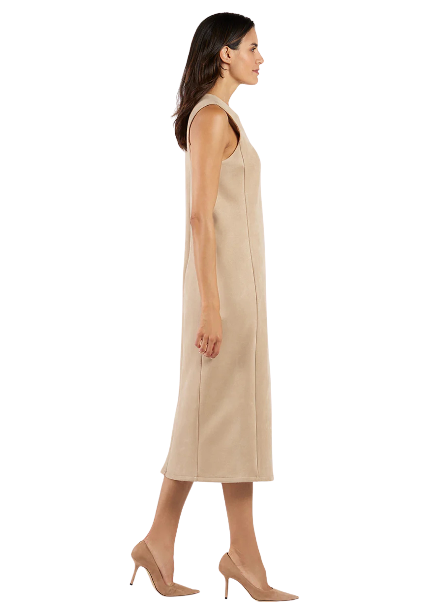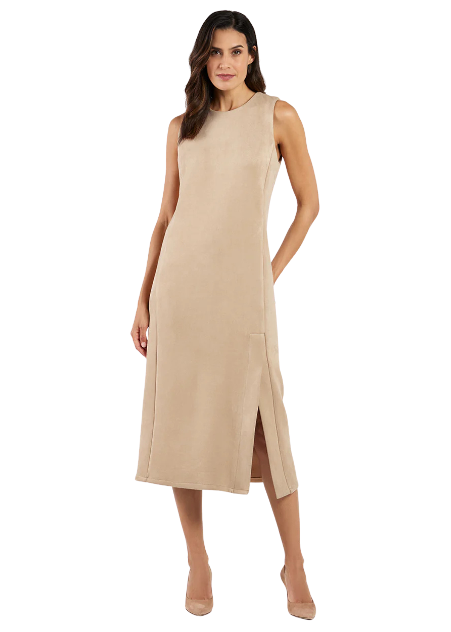Meet Darcy! This sleeveless dress is designed in a sleek sheath silhouette with a crew neckline and maxi length. Crafted in a beautiful faux suede, it offers a luxurious feel with modern polish. Just in time for the season, this dress is perfect for any occasion.