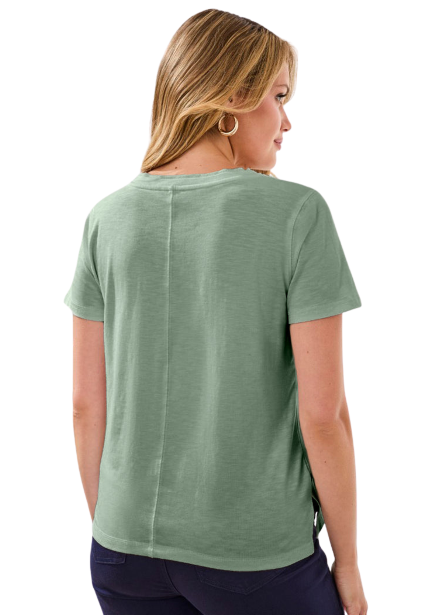 Contrast rib trim and a soft slub knit texture add modern dimension to this short sleeve V-neck top. The easy, relaxed fit and breathable hand make it perfect for spring layering, workdays, or casual weekend comfort all season long.